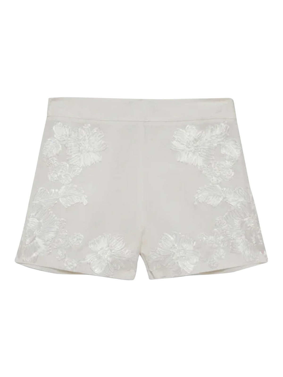 Ivory model made of soft, breathable linen with tone-on-tone soutache embroidery, hidden side zipper, short design.