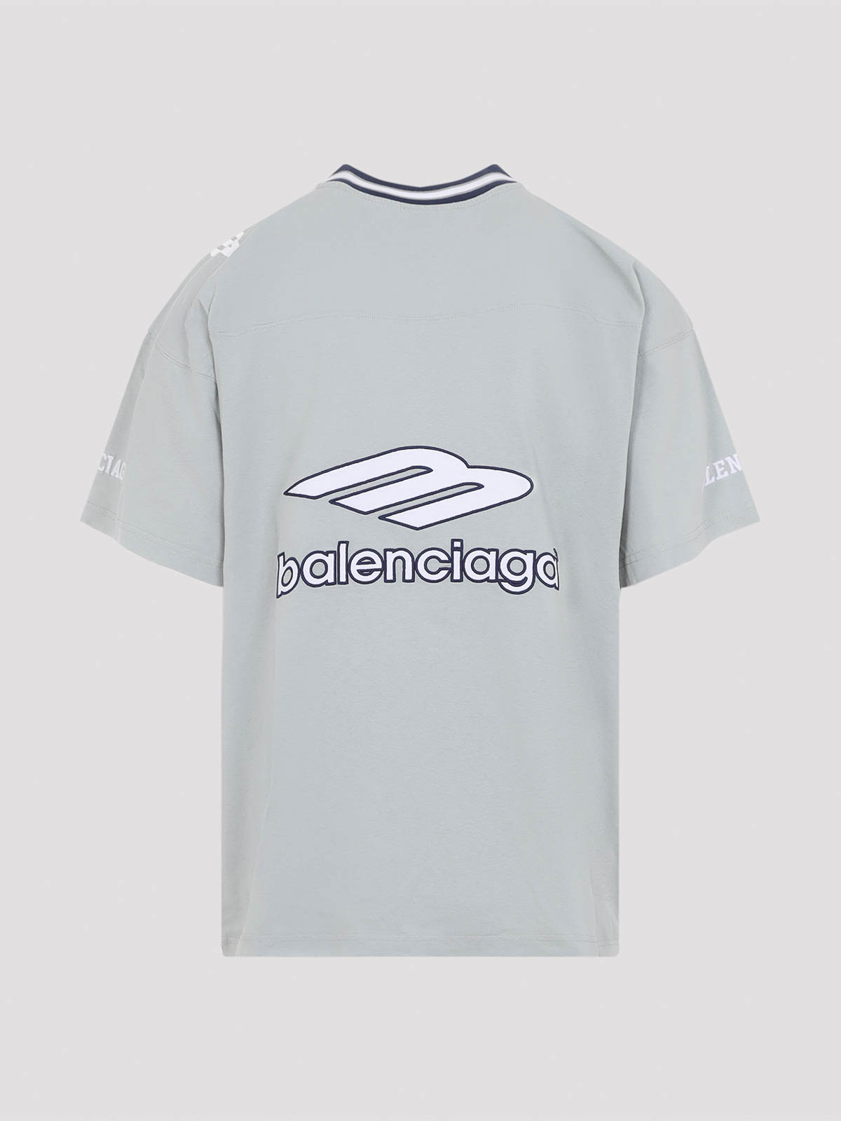 Balenciaga grey cotton v-neck oversized t-shirt. grey cotton t-shirt, v-neck with blue and white stripes on the edge, front blue and white logo, contrasting white logo on the shoulders, back white and blue logo, short sleeves, contrasting white lettering logo on the sleeves, straight hem.
