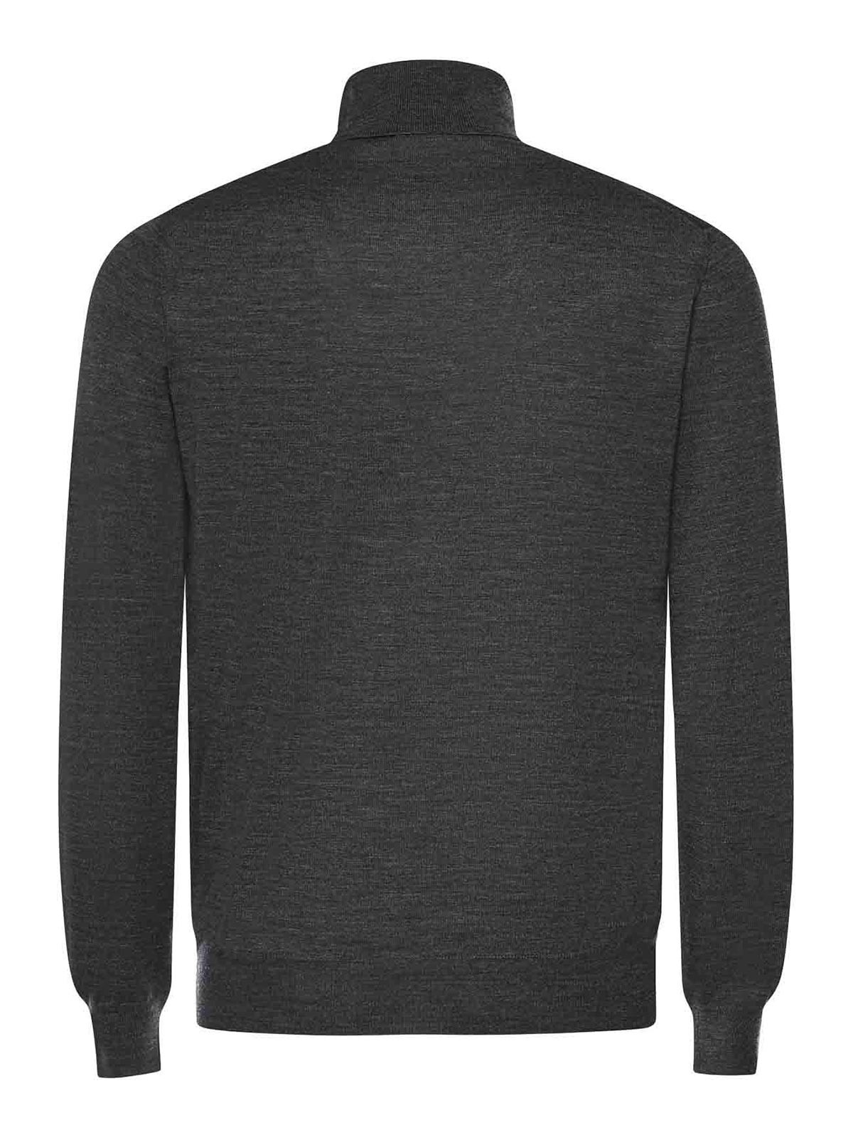 made of pure wool, high neck, long sleeves, regular fit, made in italy, size shown is 48, color: dark gray