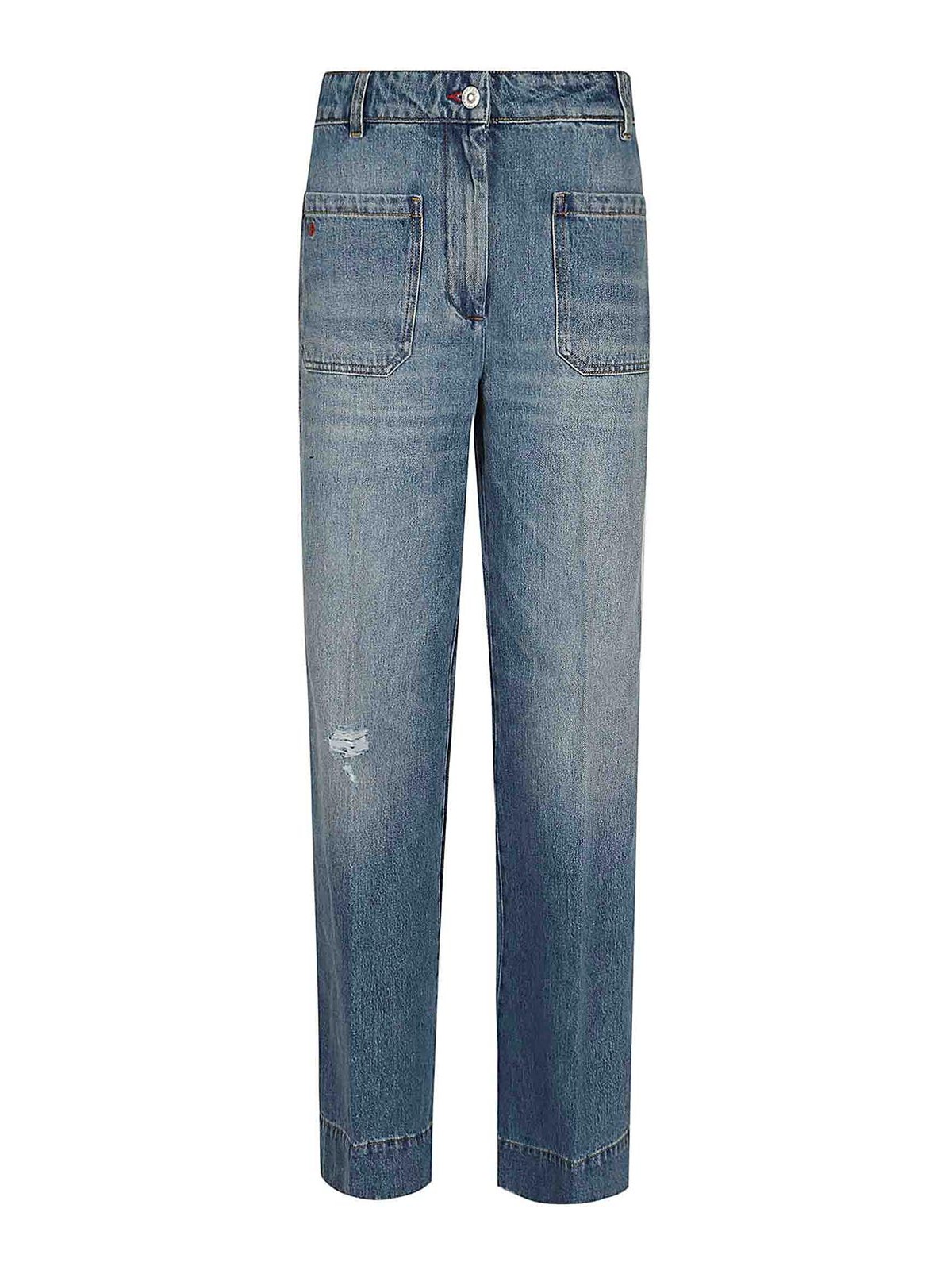Jeans alina in denim non elasticizzato by victoria beckham tasche applicate con zip nascosta e bottone con asola rossa a design vestibilita' regolare rilassata caratterizzato da toppa con marchio sulla cintura e monogramma victoria beckham ricamato in rosso