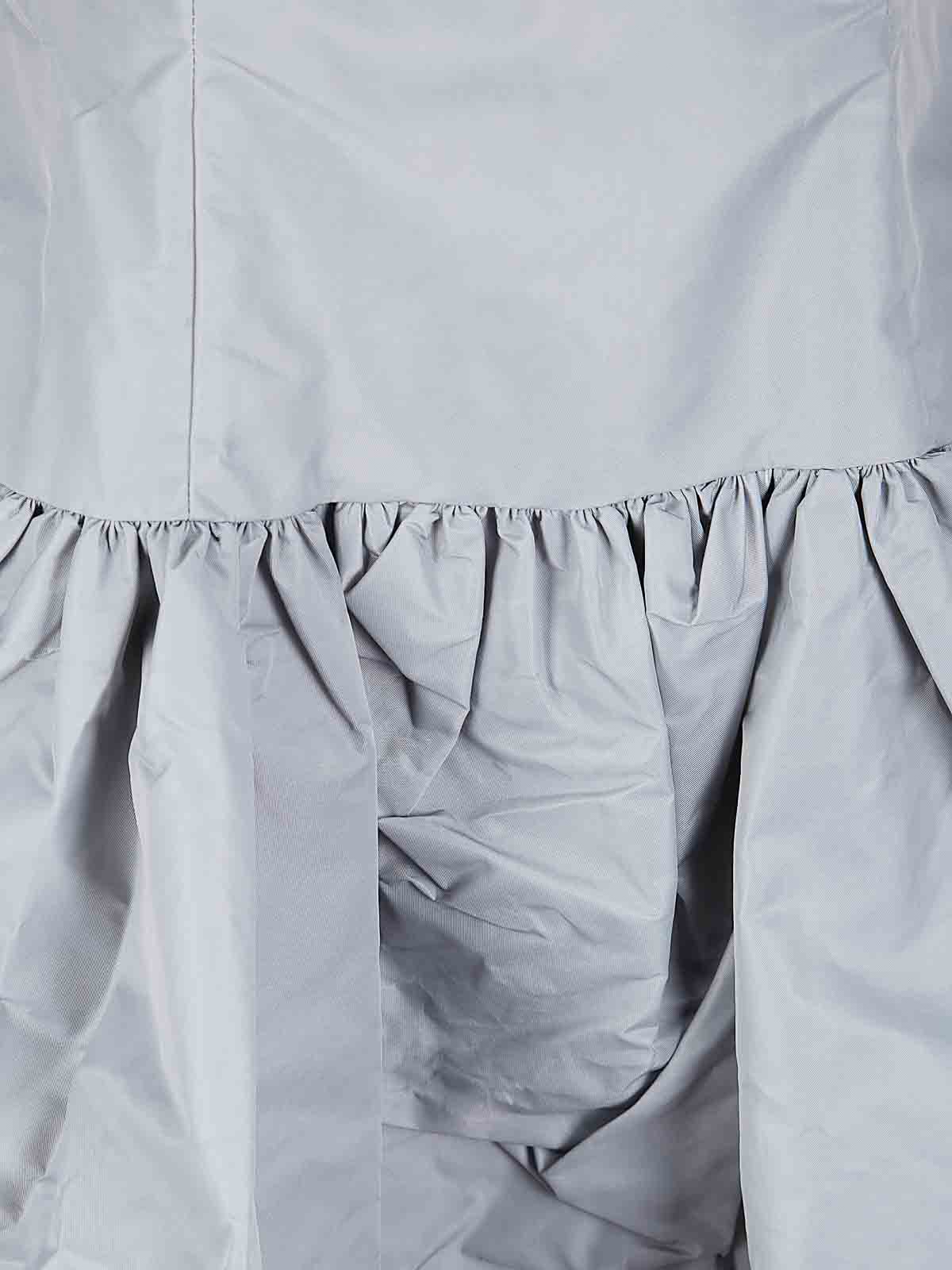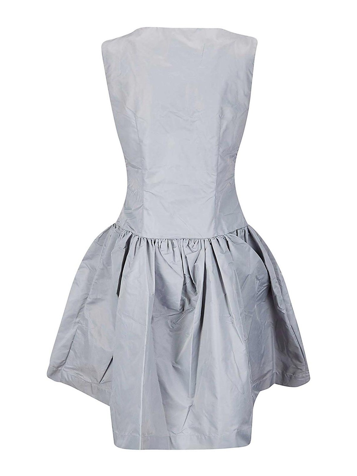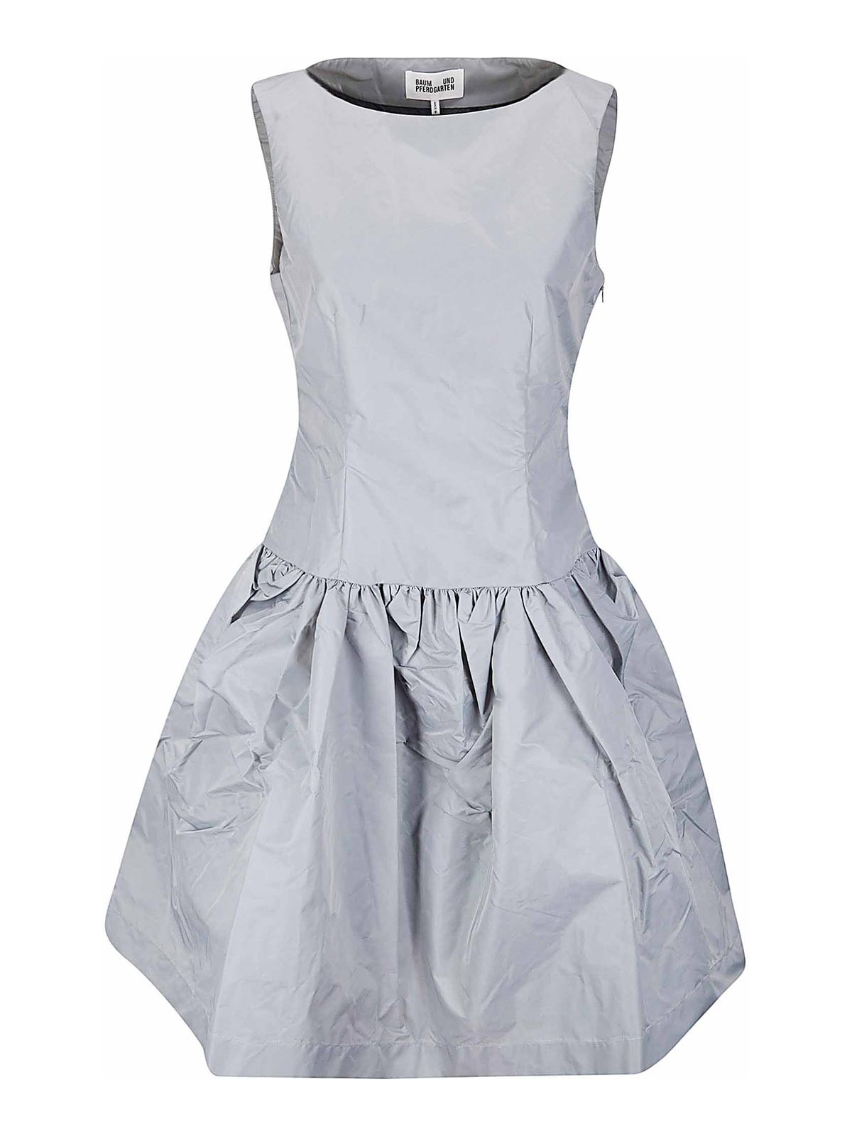Vestito in tessuto riciclato, scollo a barchetta, pinces frontali, gonna a balza, vita medio bassa.