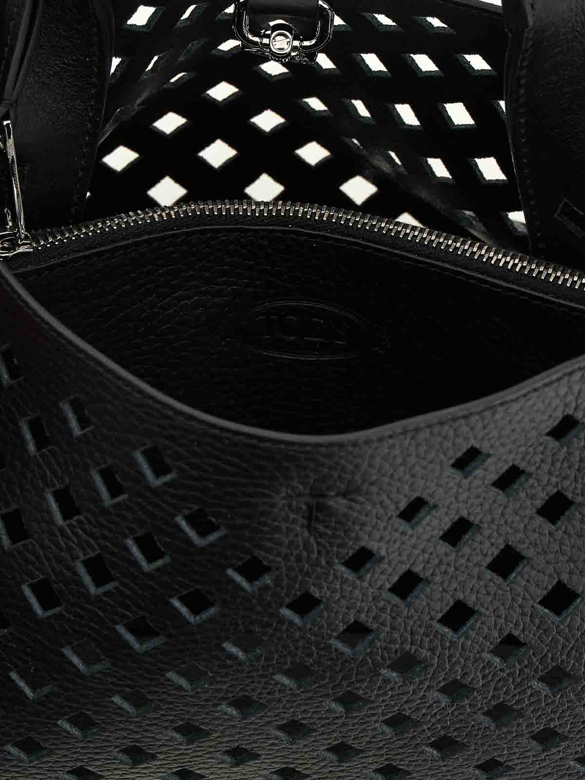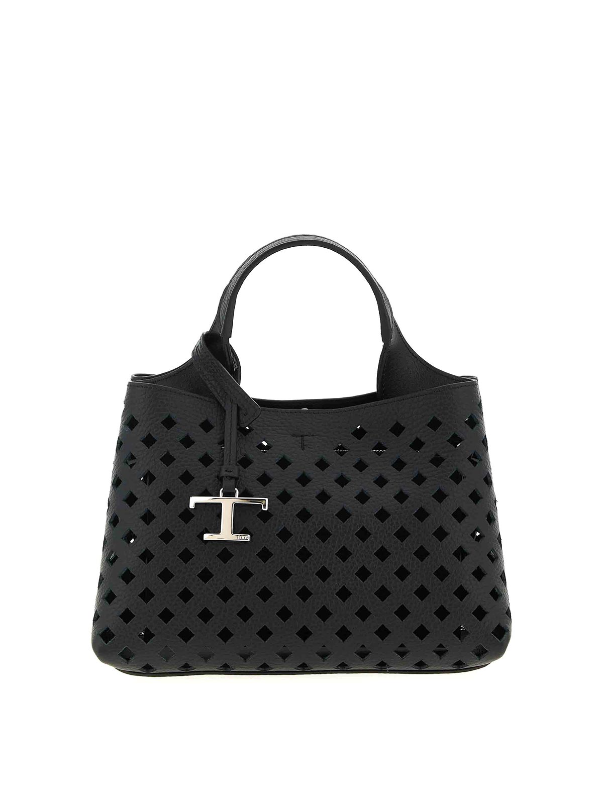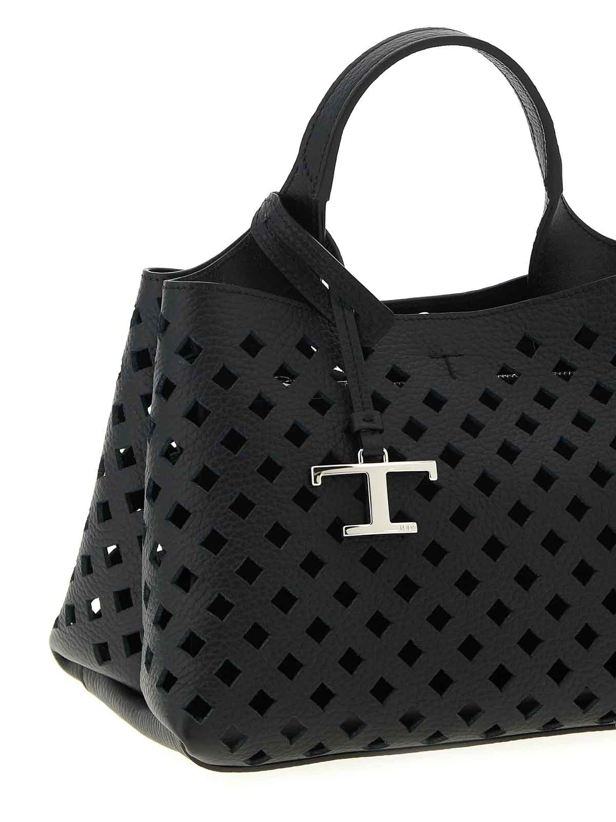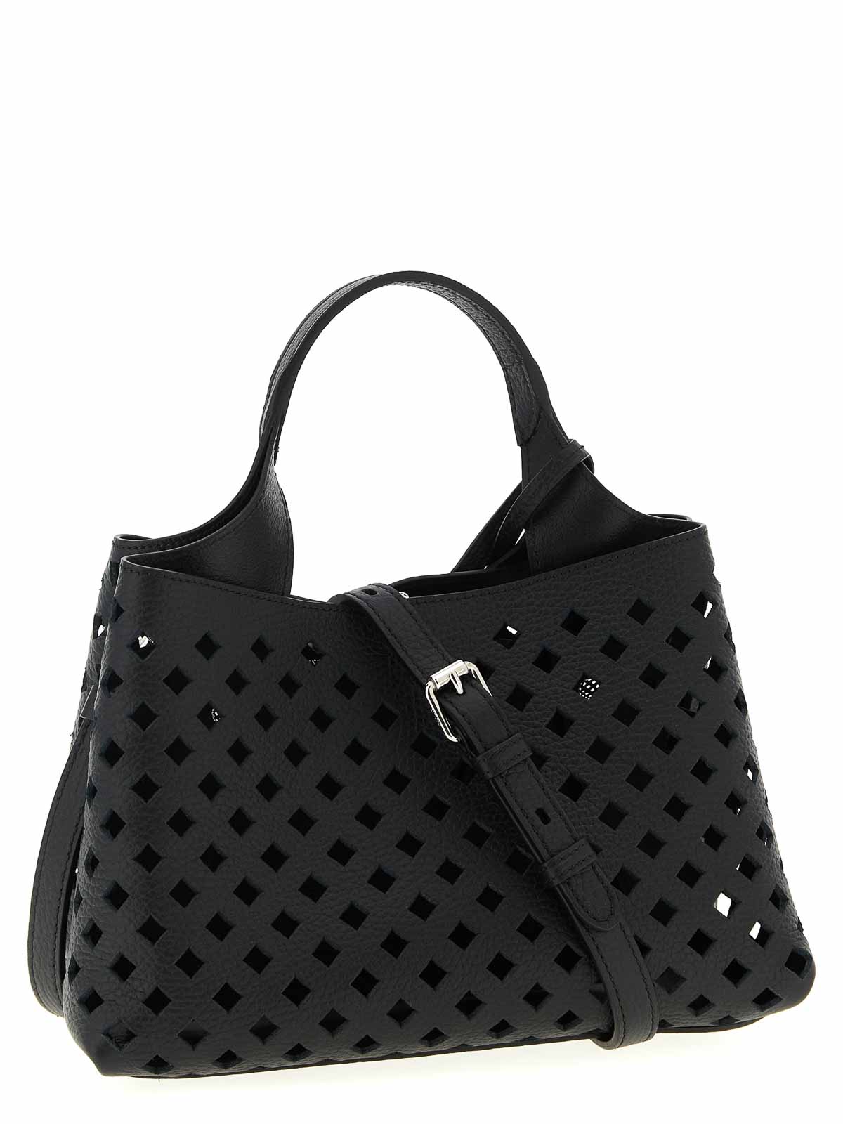 Borsa a mano 'apa micro' in pelle traforata, pendente removibile con accessorio senza tempo in metallo, chiusura con moschettone, tracolla regolabile e removibile.