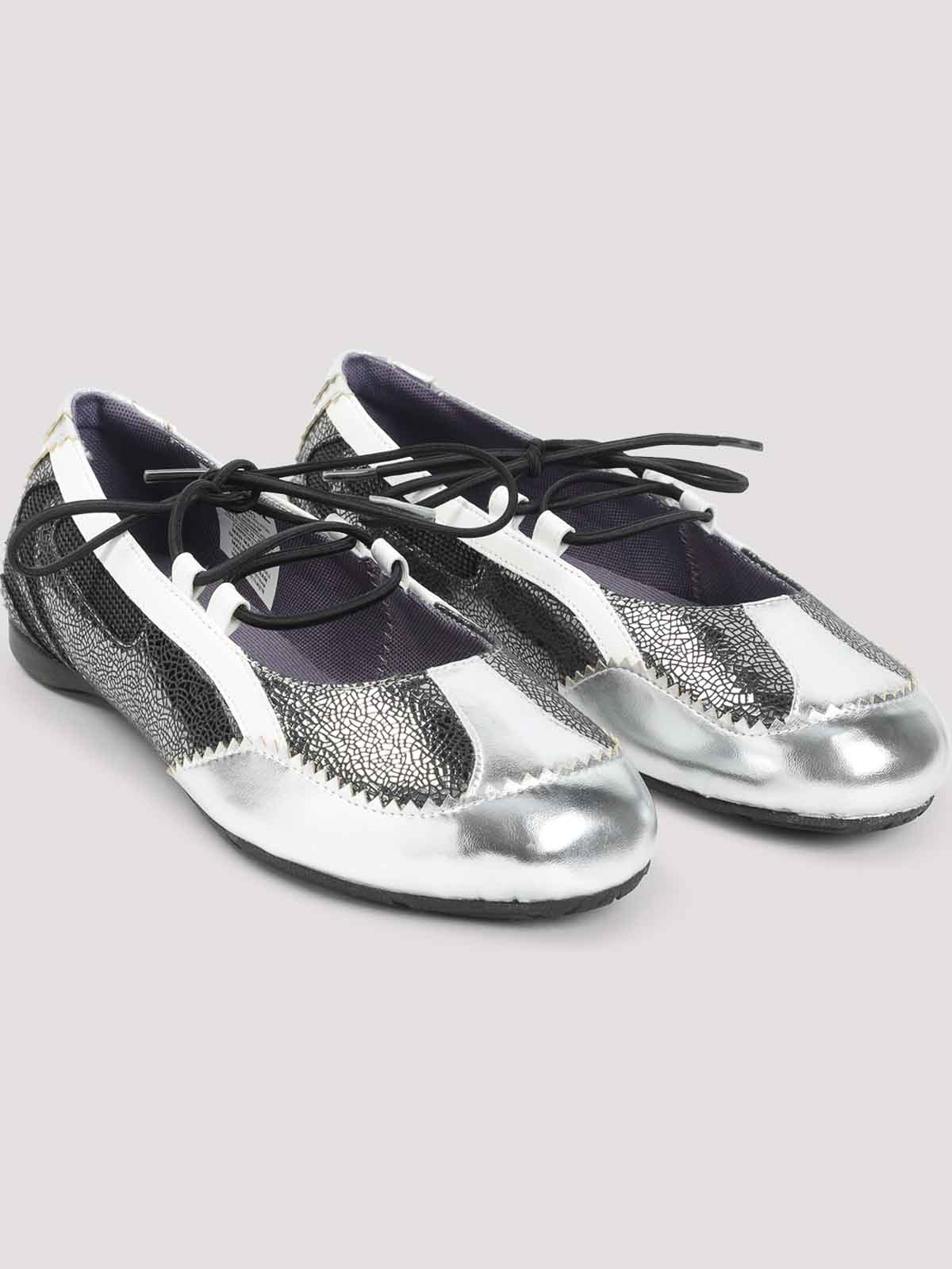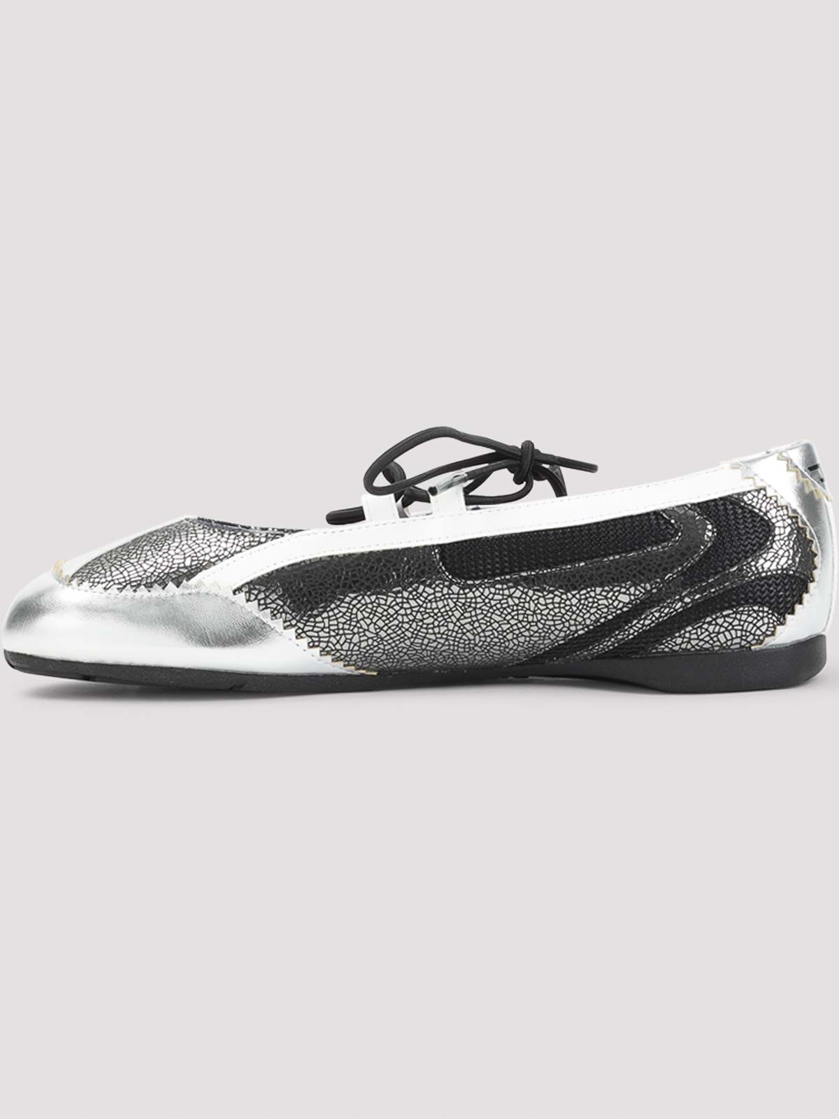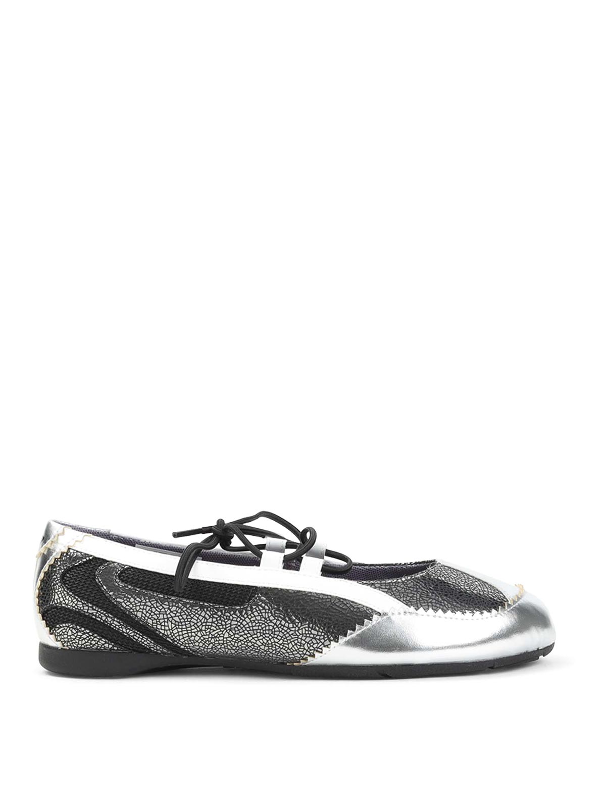 Ballerine Diesel d-mile in poliestere argento. realizzato in poliestere dai toni argento con accenti in rete nera e inserti effetto craquel, caratterizzato da punta rotonda, chiusura con lacci elasticizzati, fodera e sottopiede in tessuto e suola piatta in gomma.