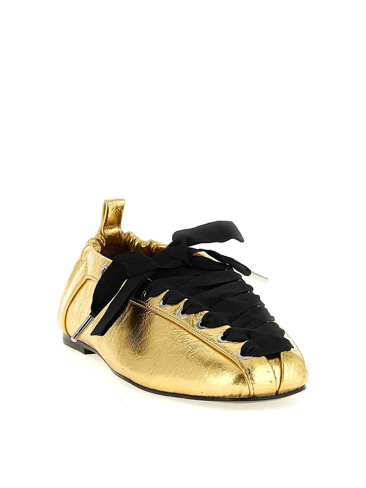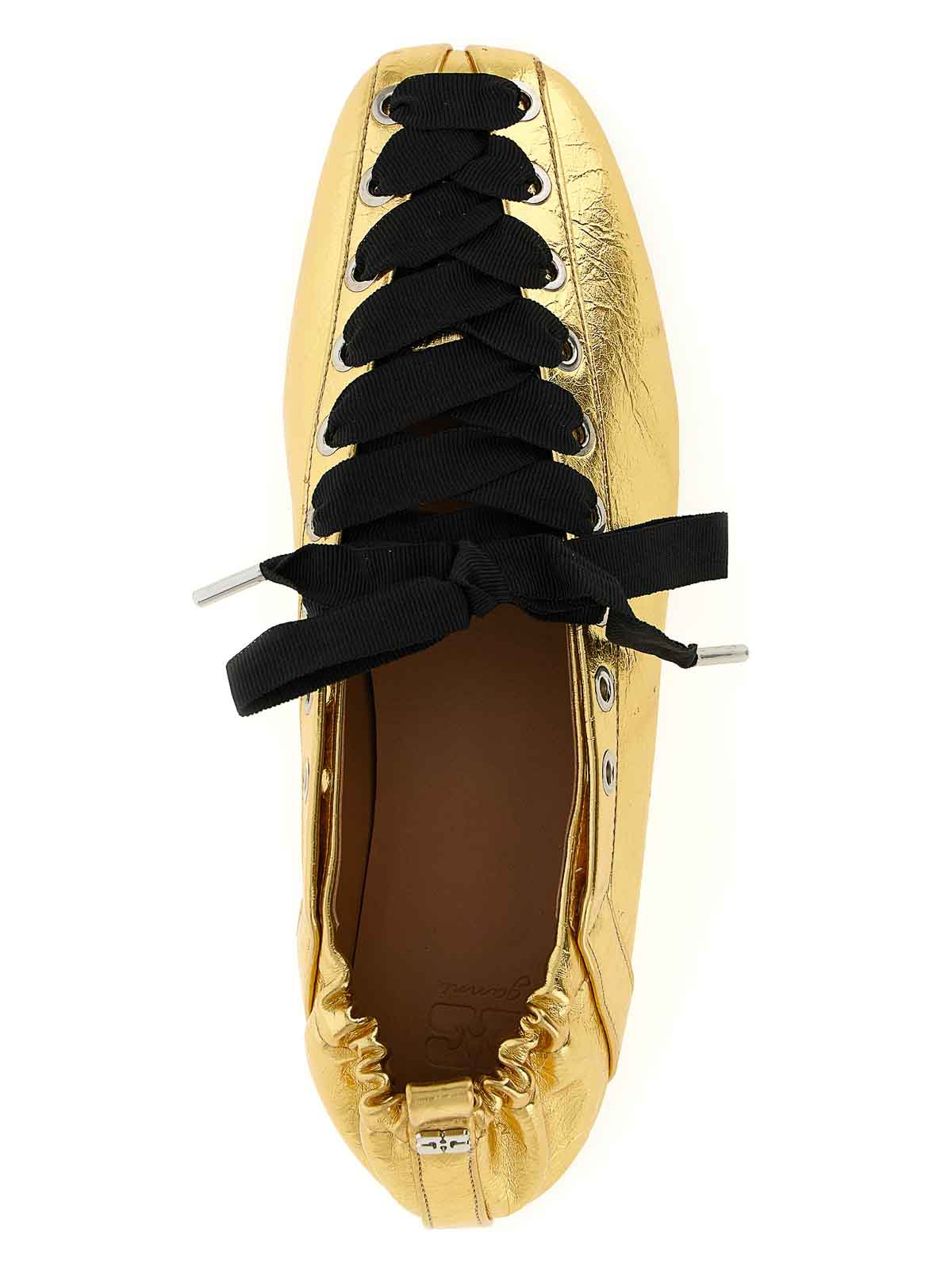 ballerine stringate in plinova con effetto pelle metallizzata craquel, occhielli in metallo, chiusura con lacci, punta squadrata arrotondata, elastico dietro, suola in cuoio.