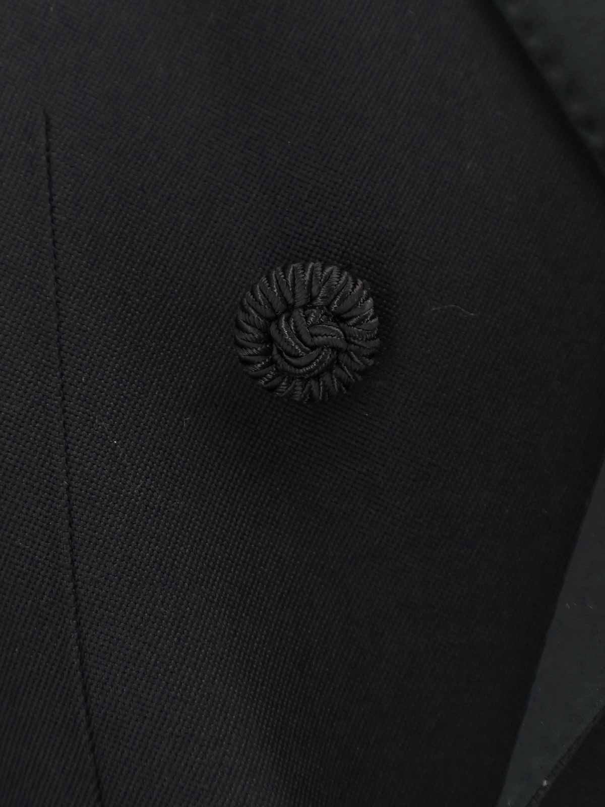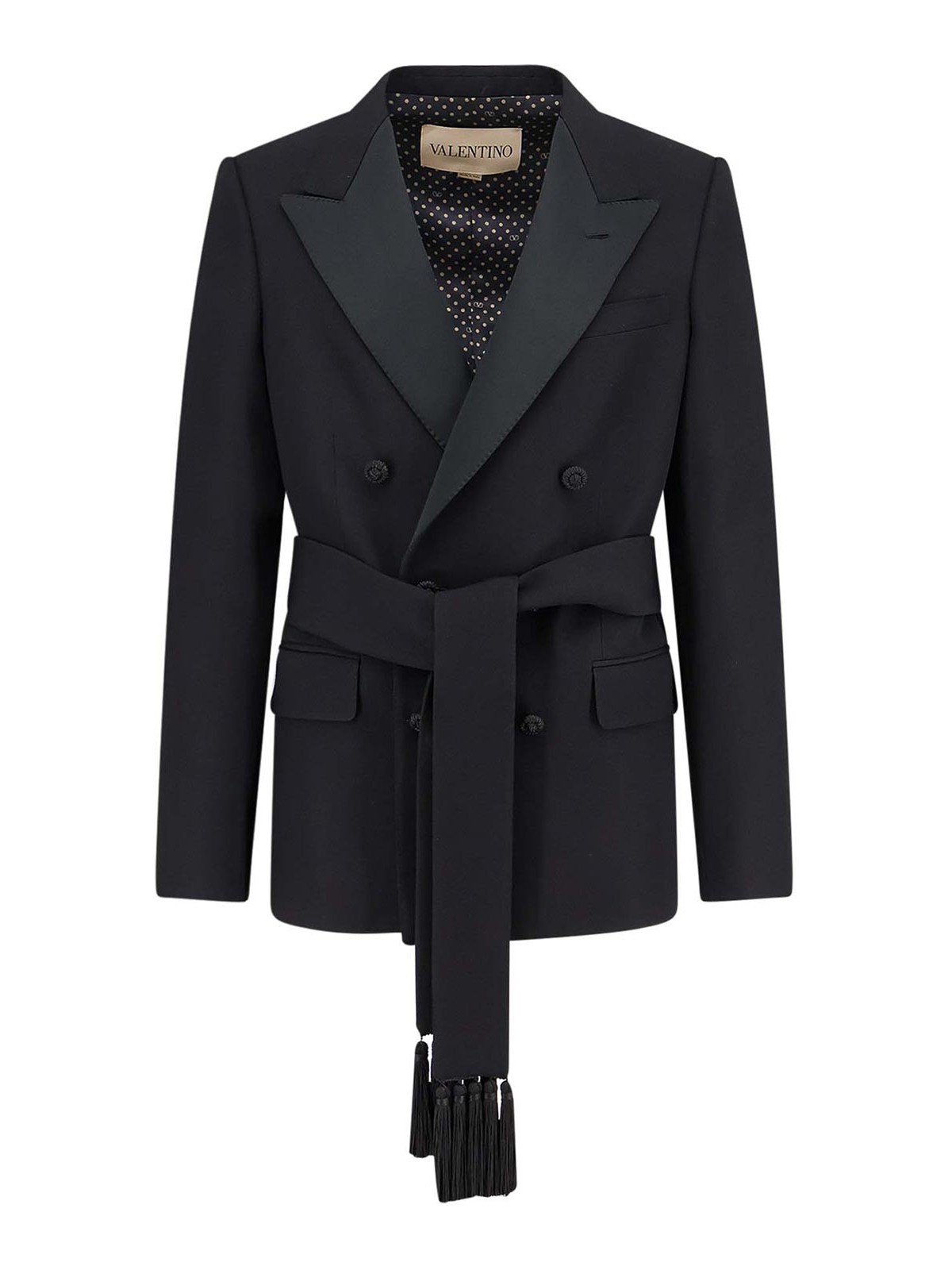 Doppiopetto, chiusura con bottoni rivestiti, ampio revers a lancia in satin, tasche con pattina sulla parte anteriore, cintura in lana vergine con frangia, made in italy, 100% lana vergine, fodera: 100% viscosa.