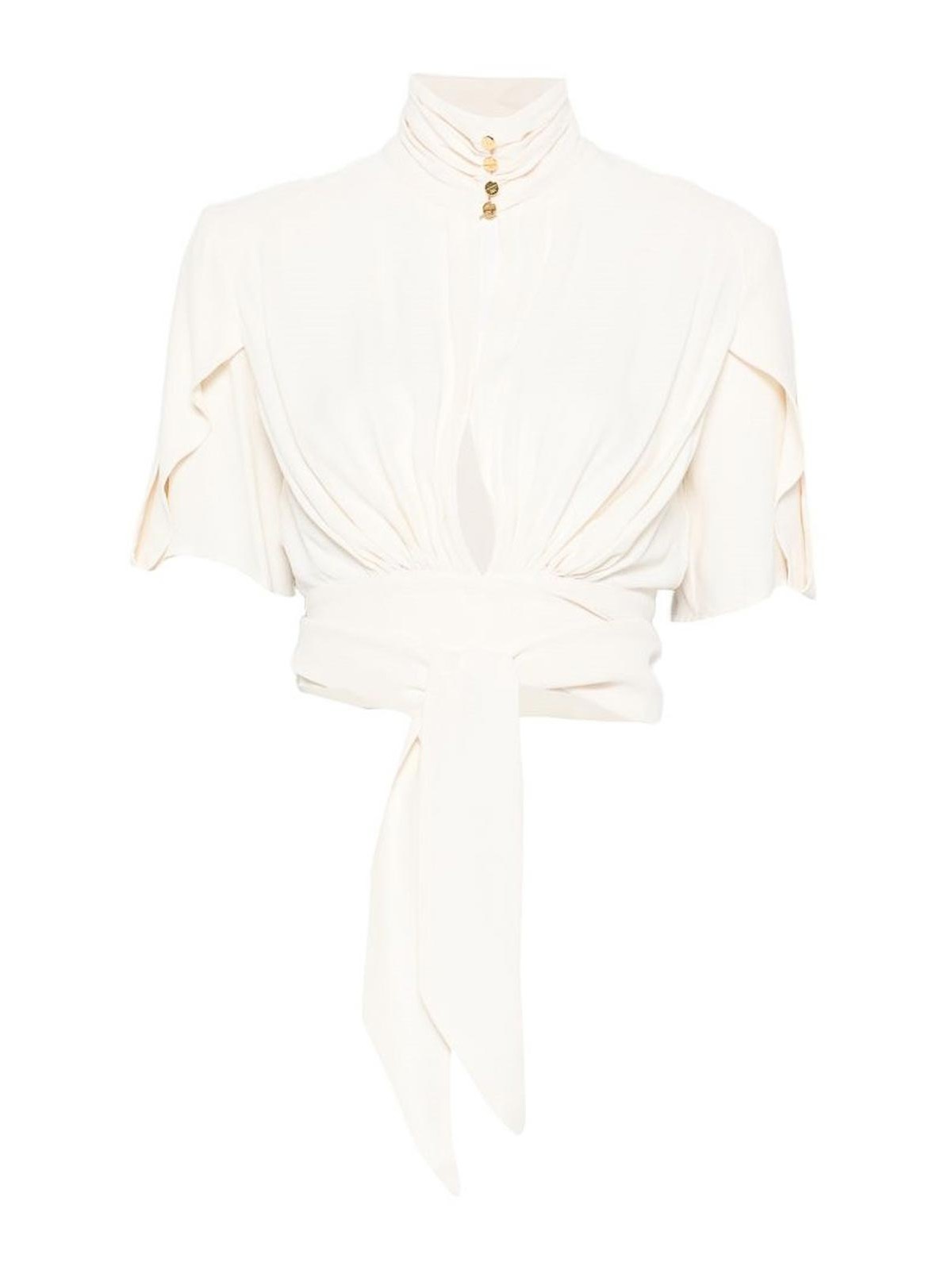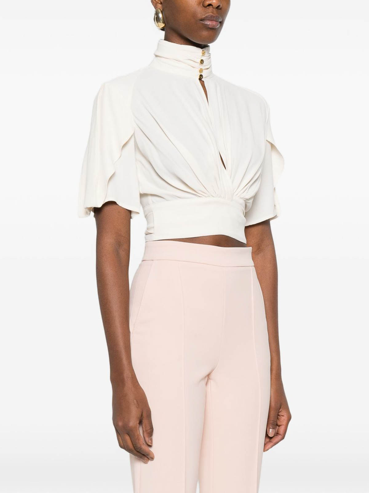 Blusa in georgette avorio con maniche corte, volant sulle spalle e parte centrale drappeggiata con fusciacca sullo scollo alto accentuato da bottoni in tono che aggiungono un tocco di lusso