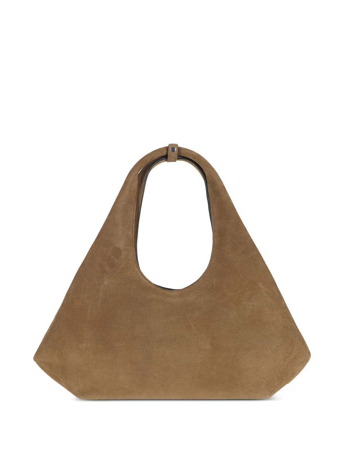 Borsa a tracolla ripiegata con manico superiore in pelle scamosciata marrone di Coperni con logo color argento, manico superiore e tracolla ripiegata. combinando design contemporaneo e funzionalità, questa borsa è perfetta per valorizzare gli outfit da giorno o da sera. la sua struttura compatta e i dettagli distintivi lo rendono un accessorio versatile e di spicco in ogni guardaroba moderno