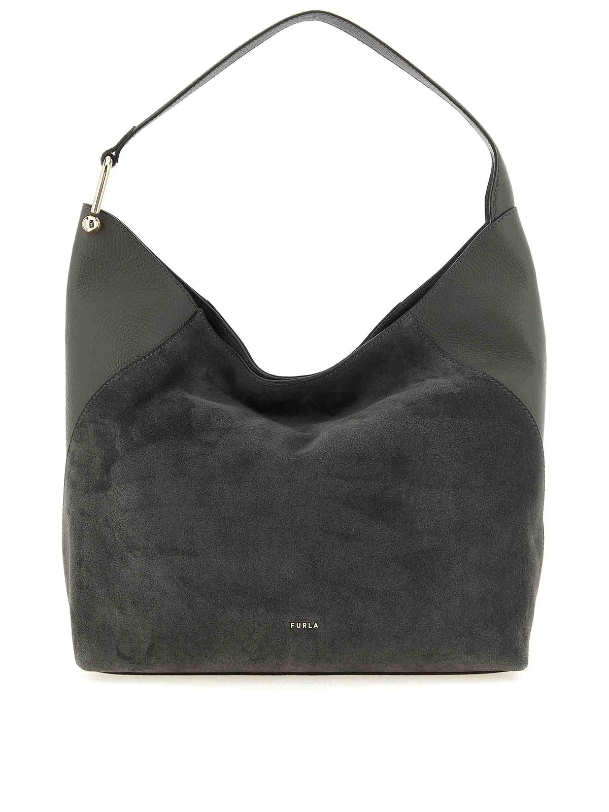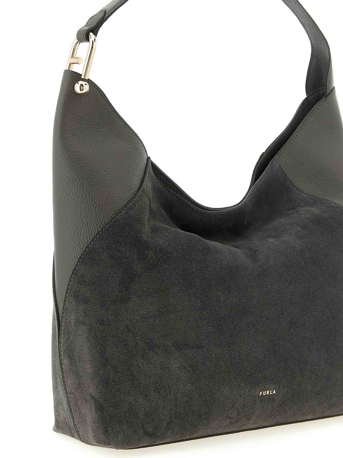 borsa a tracolla grande 'furla lara' in pelle scamosciata e pelle di vitello liscia tono su tono, logo lettering in metallo frontale, chiusura magnetica, manico fisso con iconico logo arco con elemento sferico in metallo.