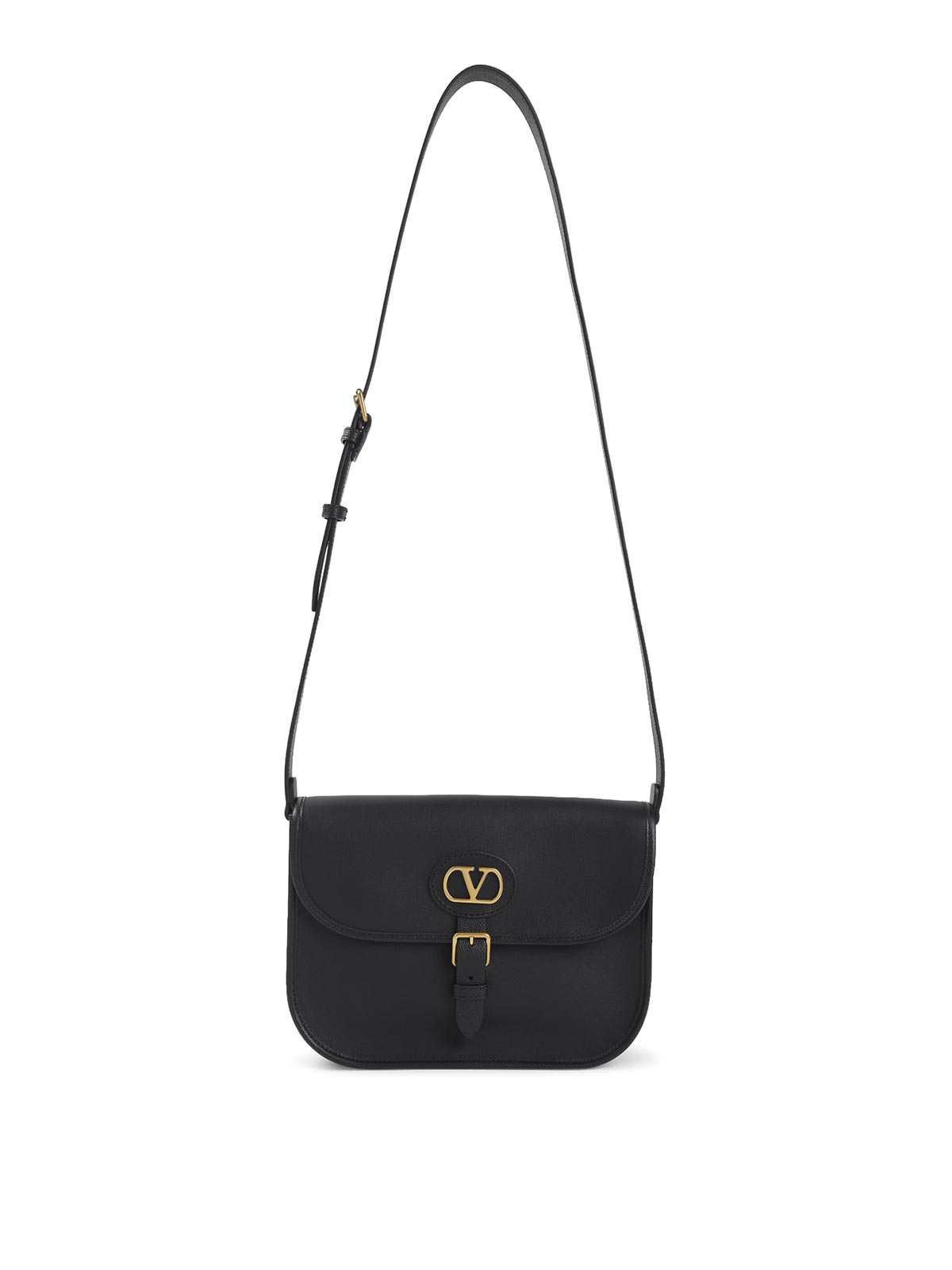 Borsa a tracolla Valentino Garavani in pelle nera. realizzata in pelle martellata nera, caratterizzata da hardware color oro, vlogo in metallo sul davanti, cinturino con cintura e chiusura magnetica nascosta, tracolla regolabile, fessura interna per carte e tasca con zip.