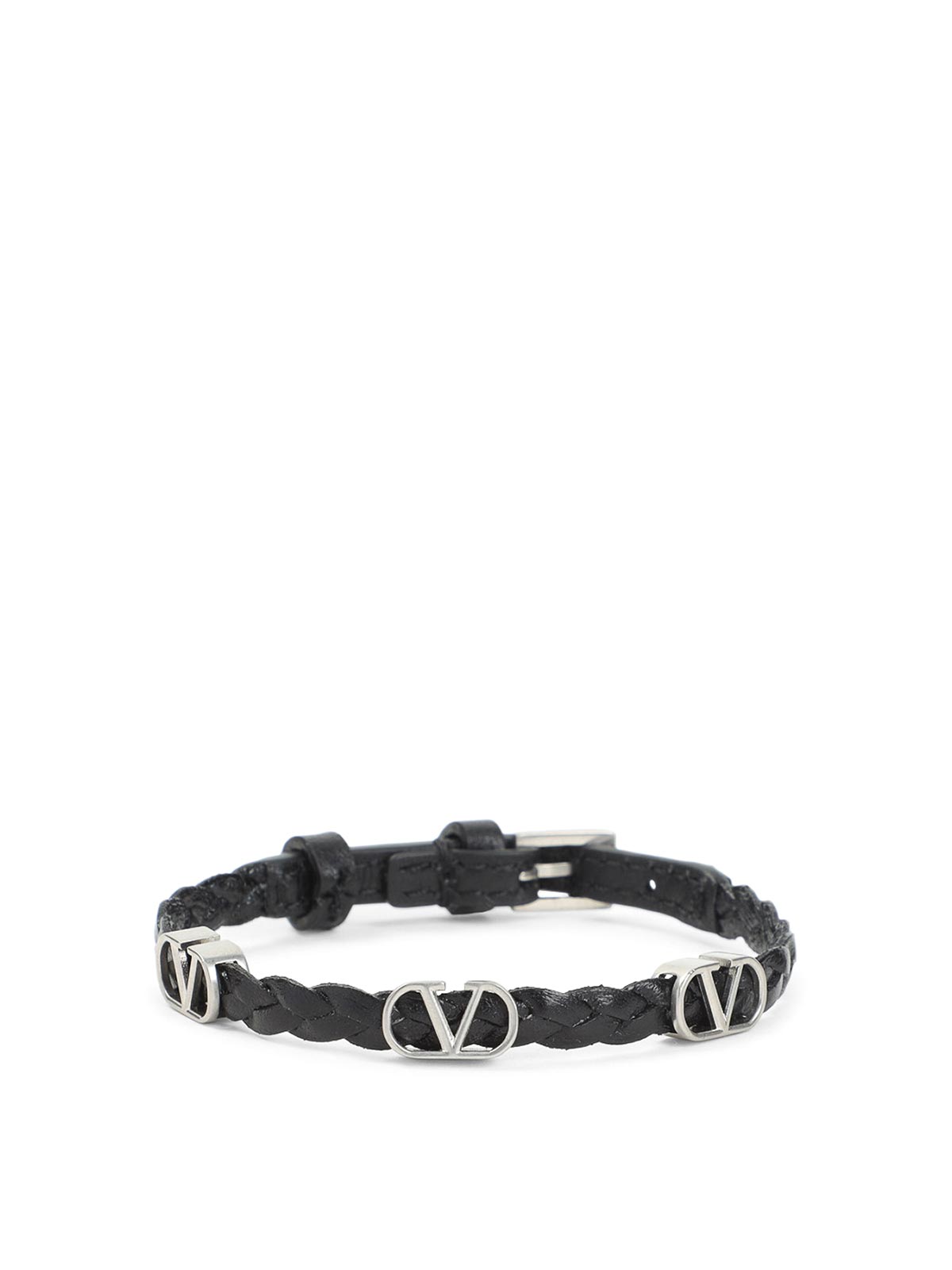 Bracciale Valentino Garavani in pelle di vitello nera. bracciale in pura pelle di vitello nera, dettaglio frontale con tre logo V color argento, cinturini in pelle intrecciata tono su tono, fibbia posteriore color argento, passante per cintura, design regolabile.