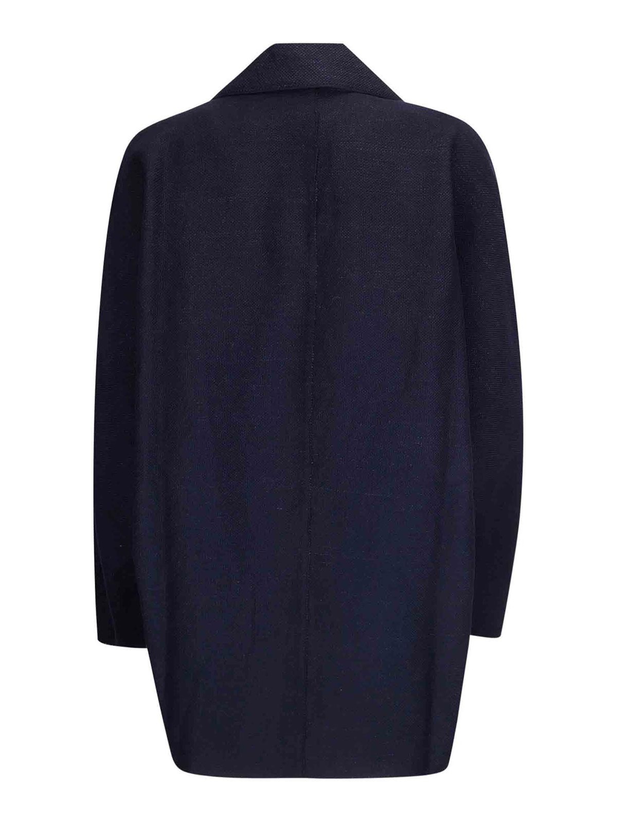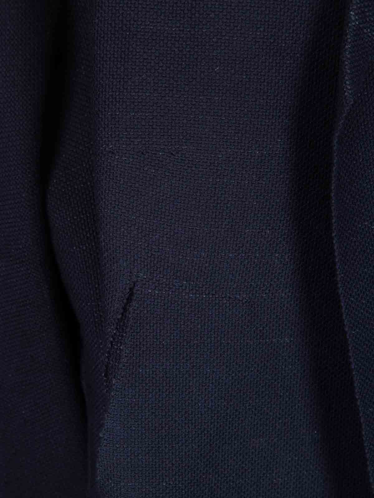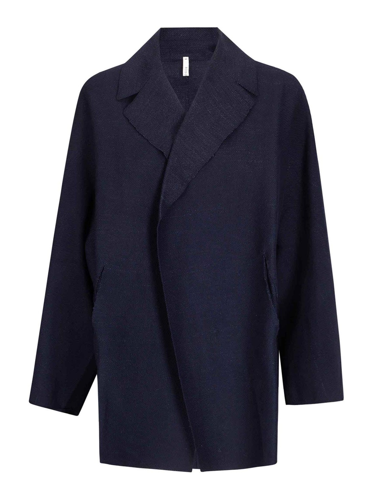Giacca in cotone e lino con rever classico, senza bottoni, maniche a tre quarti senza cucitura spalla.