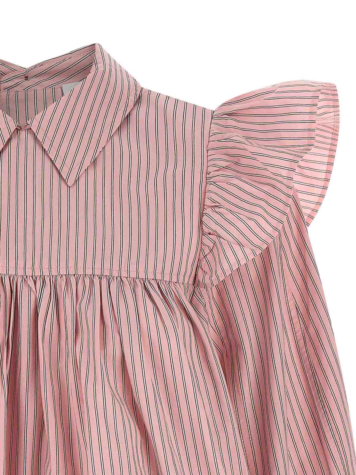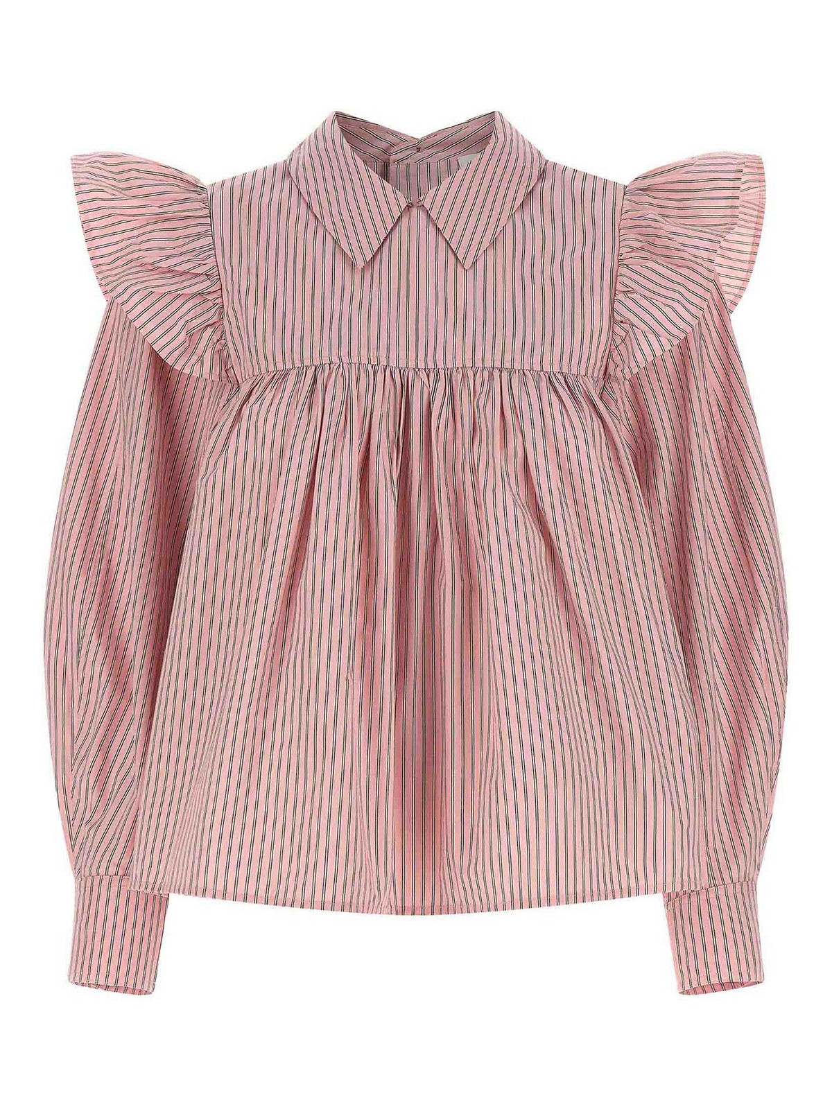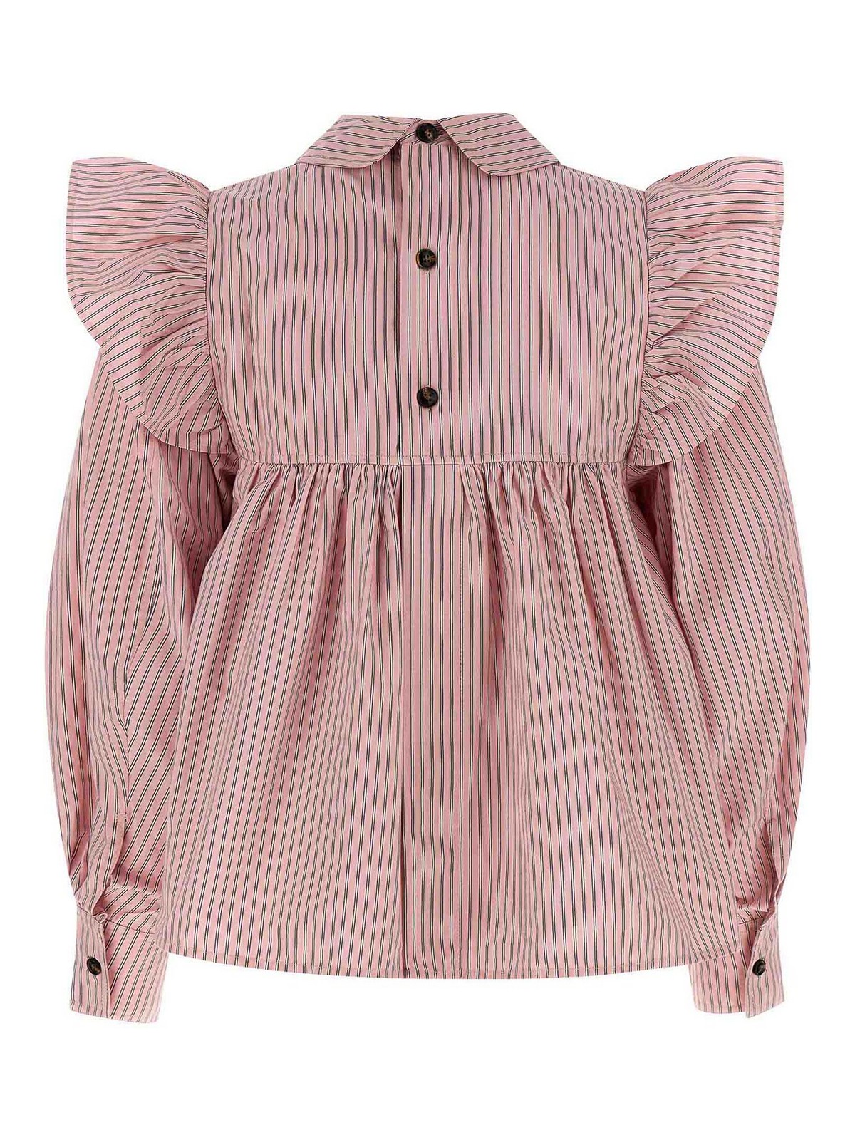 Blusa in cotone rigato Oxford, colletto, volant sulle spalle, chiusura con bottoni sul retro, maniche lunghe con polsino.