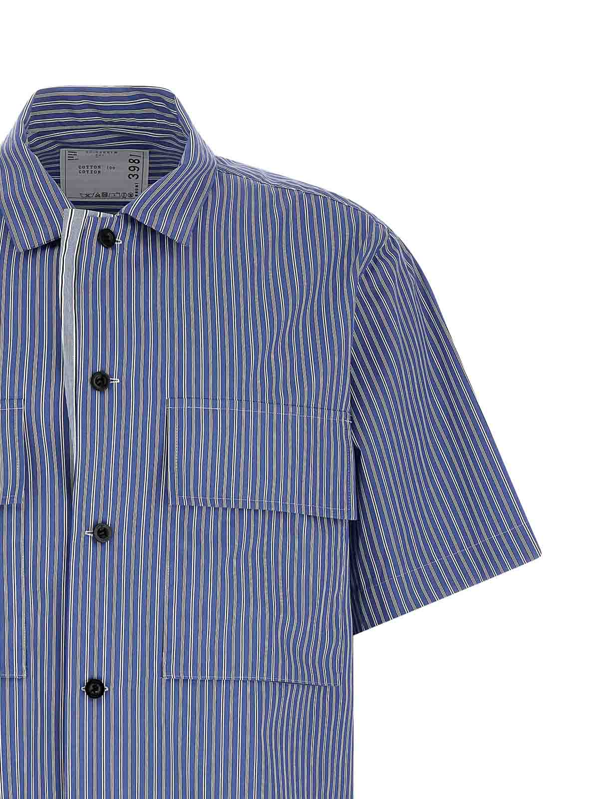 Camicia in popeline di cotone rigato, inserto frontale doppio strato con chiusura a bottoni, tasche, maniche corte, spacchetti laterali.
