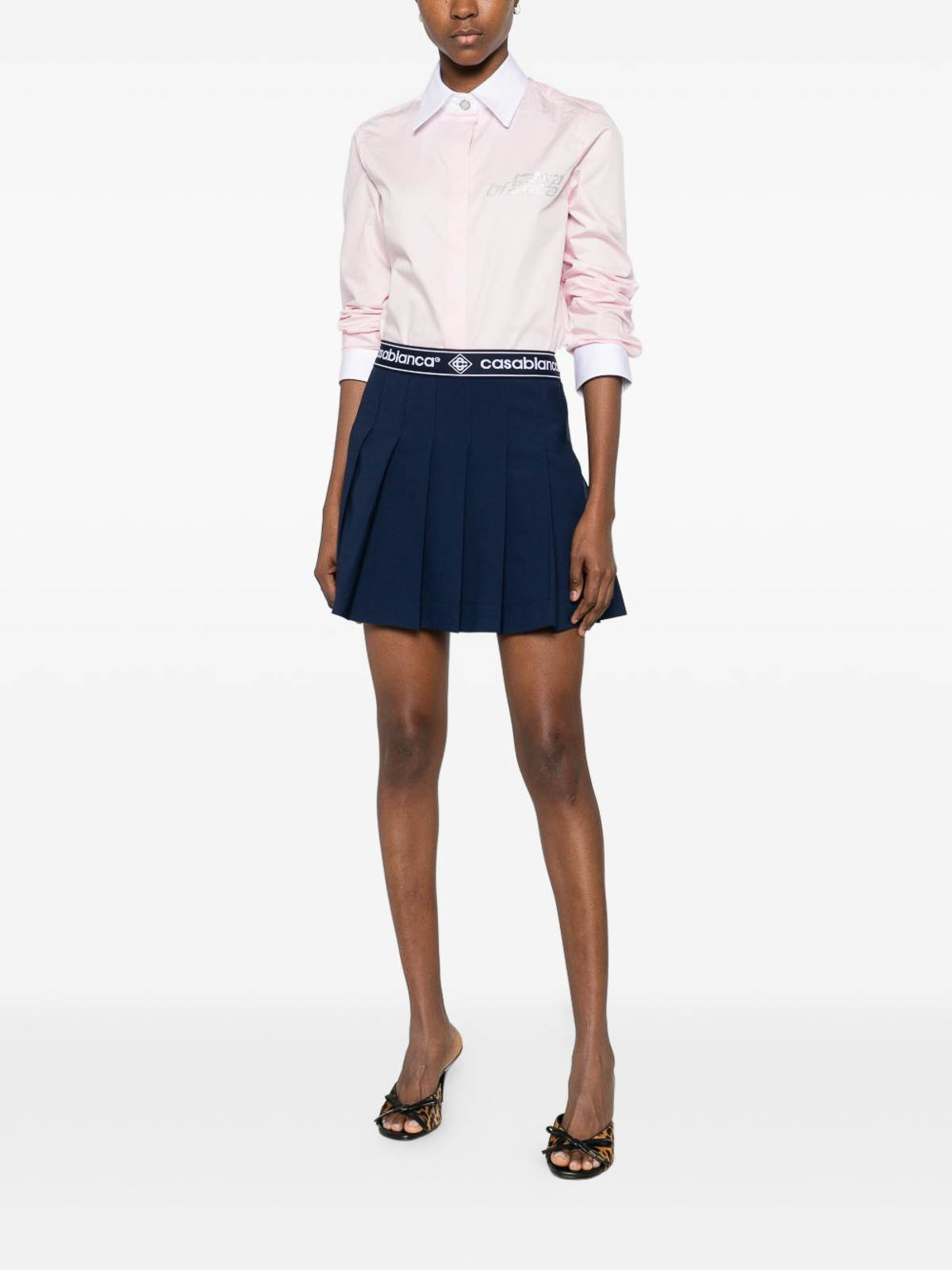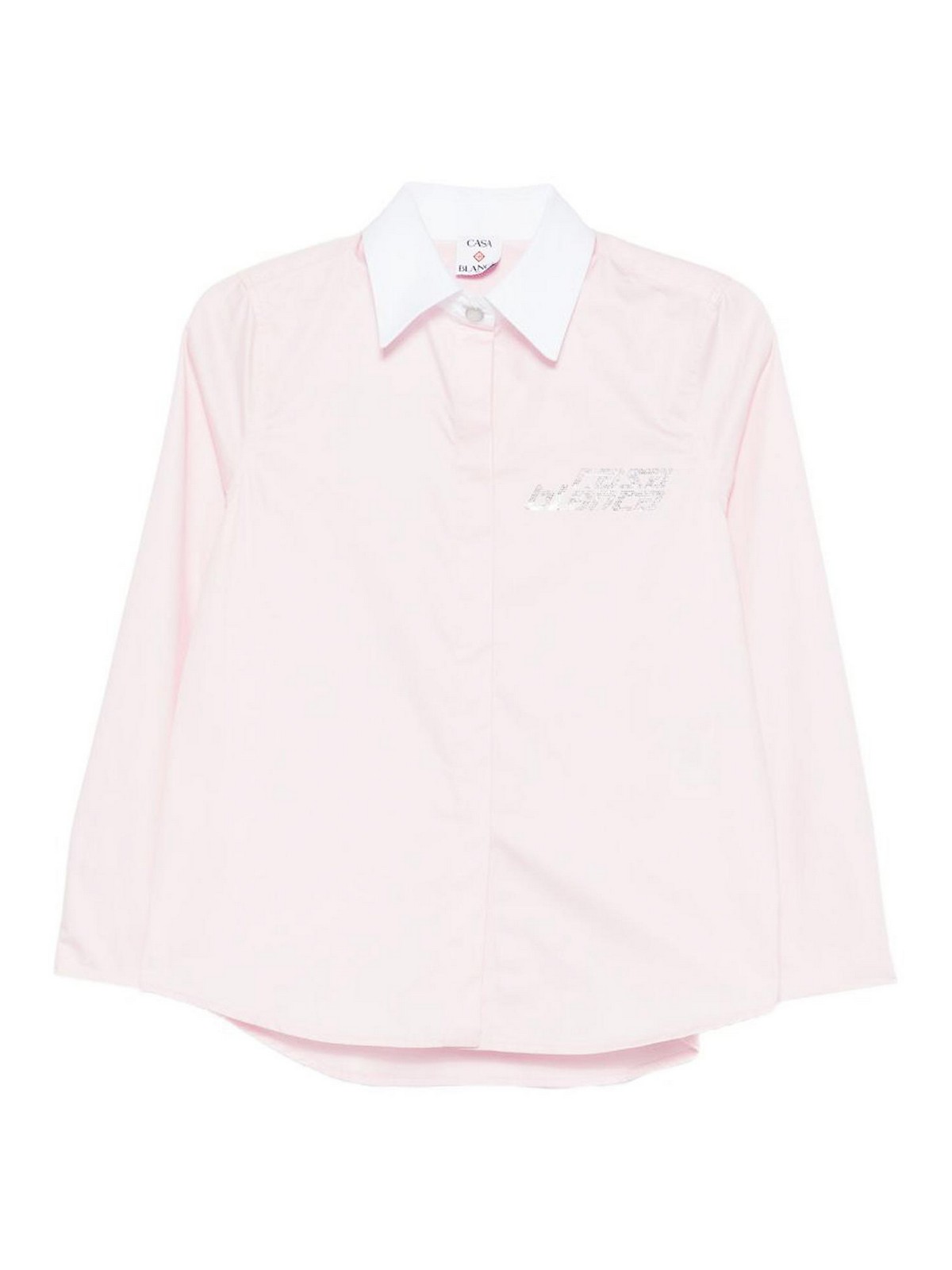 Camicia rosa in cotone di Casablanca, caratterizzata da colletto polo bianco, maniche lunghe e chiusura frontale con bottoni. arricchita dal logo impreziosito da cristalli sul petto, questa maglia aggiunge un dettaglio raffinato e distintivo. il tessuto morbido e traspirante assicura comfort e vestibilità naturale, mentre il design elegante lo rende perfetto per outfit casual-chic, look moderni da ufficio o sofisticati capi per il tempo libero. un pezzo distintivo del brand, ideale per chi cerca uno stile contemporaneo con dettagli distintivi.