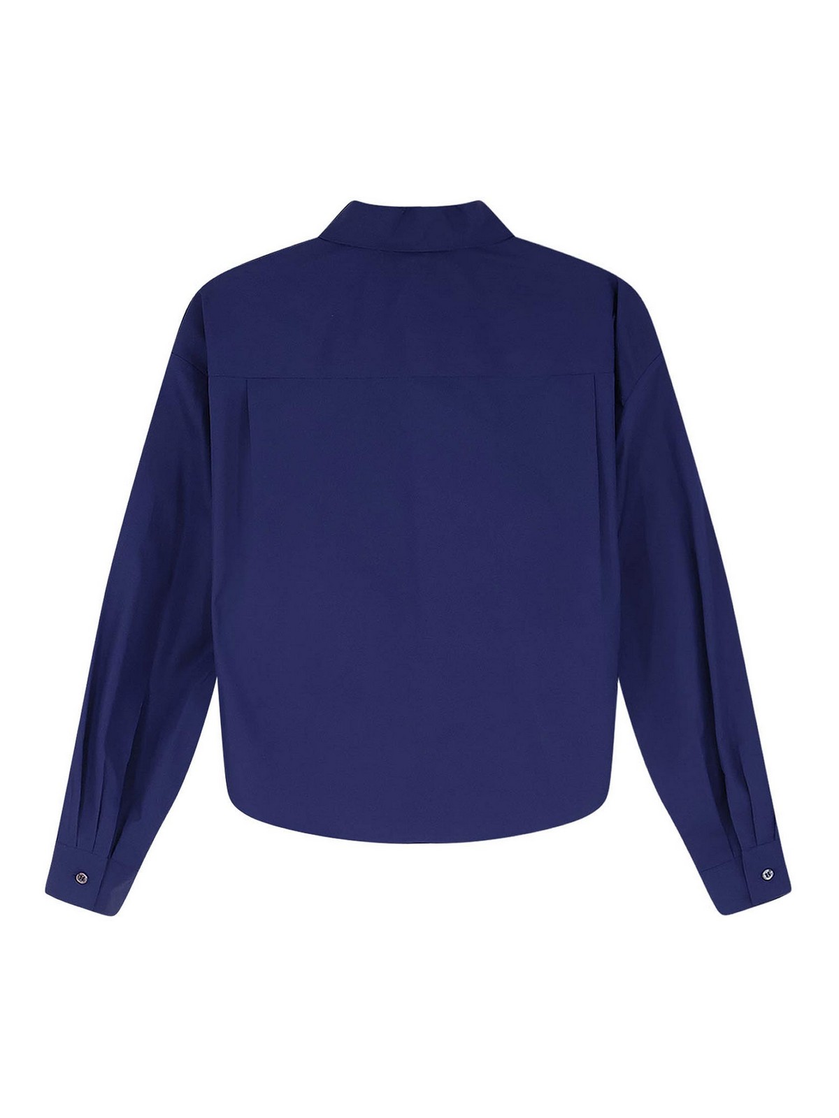 Crop fit, chiusura con bottoni, colletto a punta, manica lunga con polsino e bottone, fondo stondato, 100% cotone.