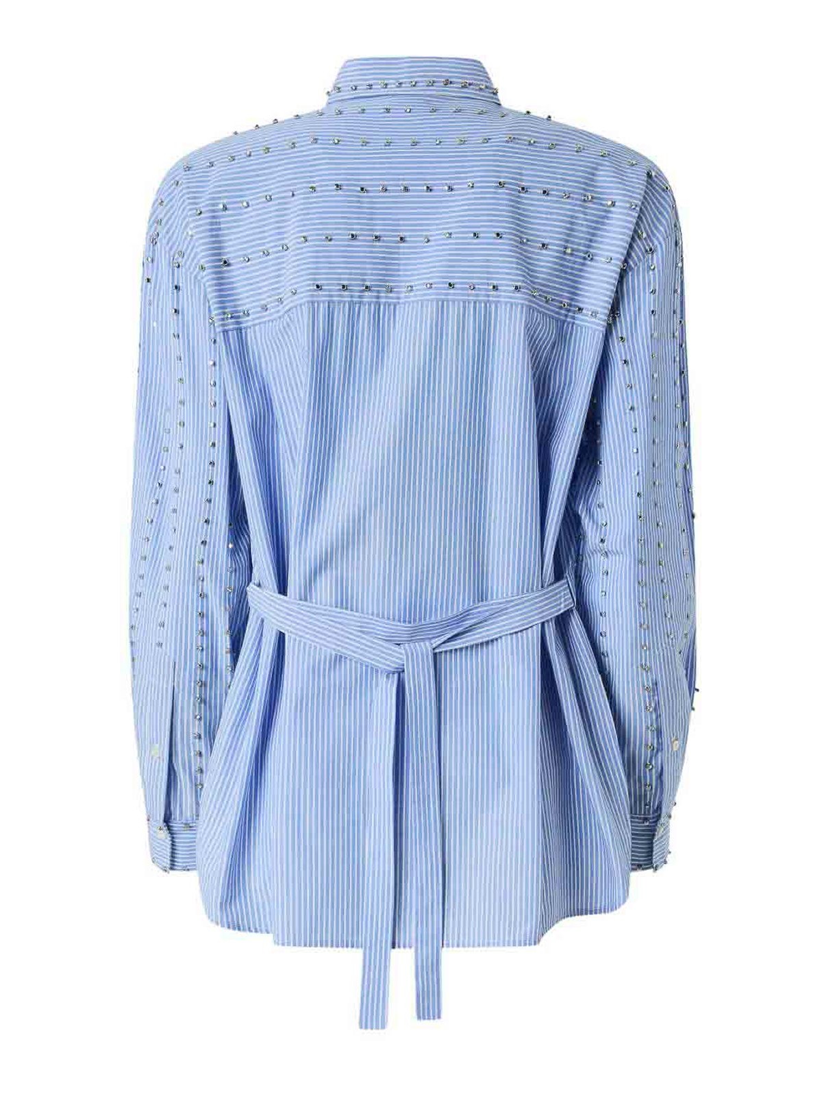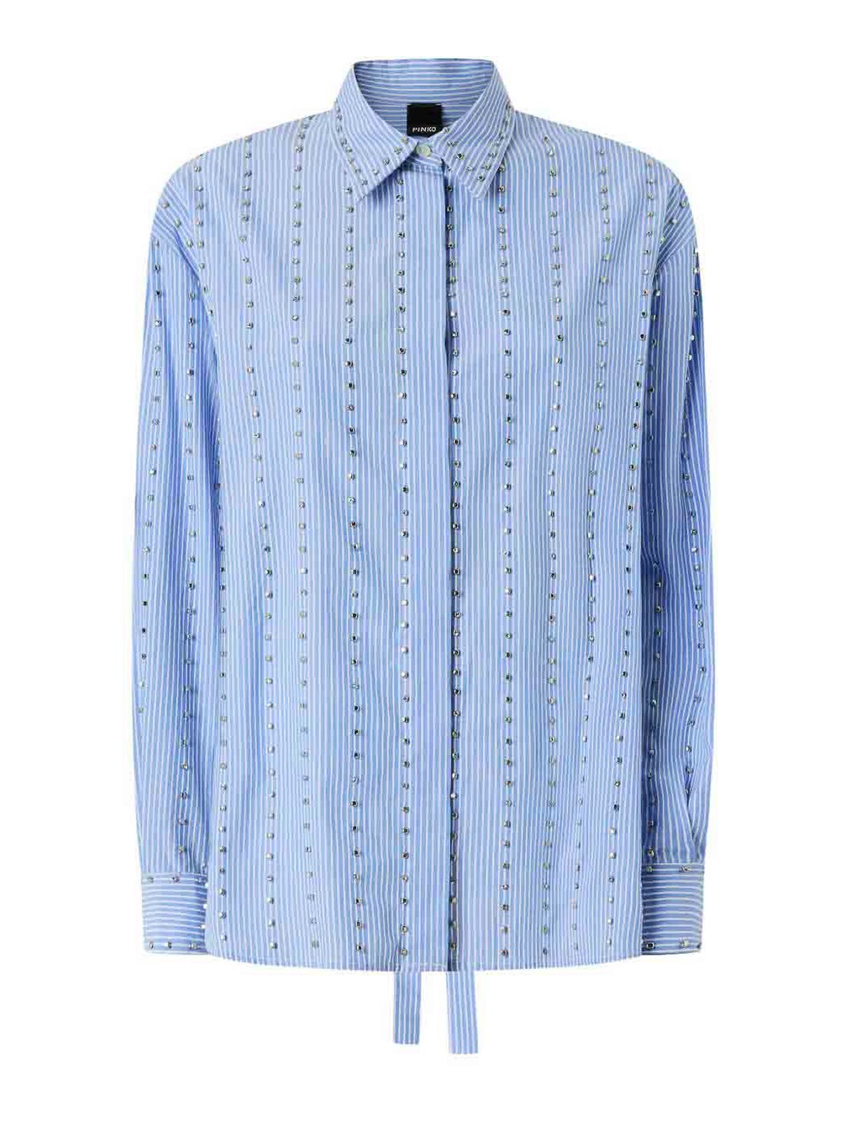 Camicia in cotone azzurro con decorazione di strass, colletto classico, cinturini da annodare e chiusura frontale nascosta di pinko, caratterizzata da dettagli raffinati e una silhouette sartoriale. Ideale per raffinati outfit quotidiani o look chic da sera, questa camicia combina eleganza femminile, stile contemporaneo e accenti scintillanti