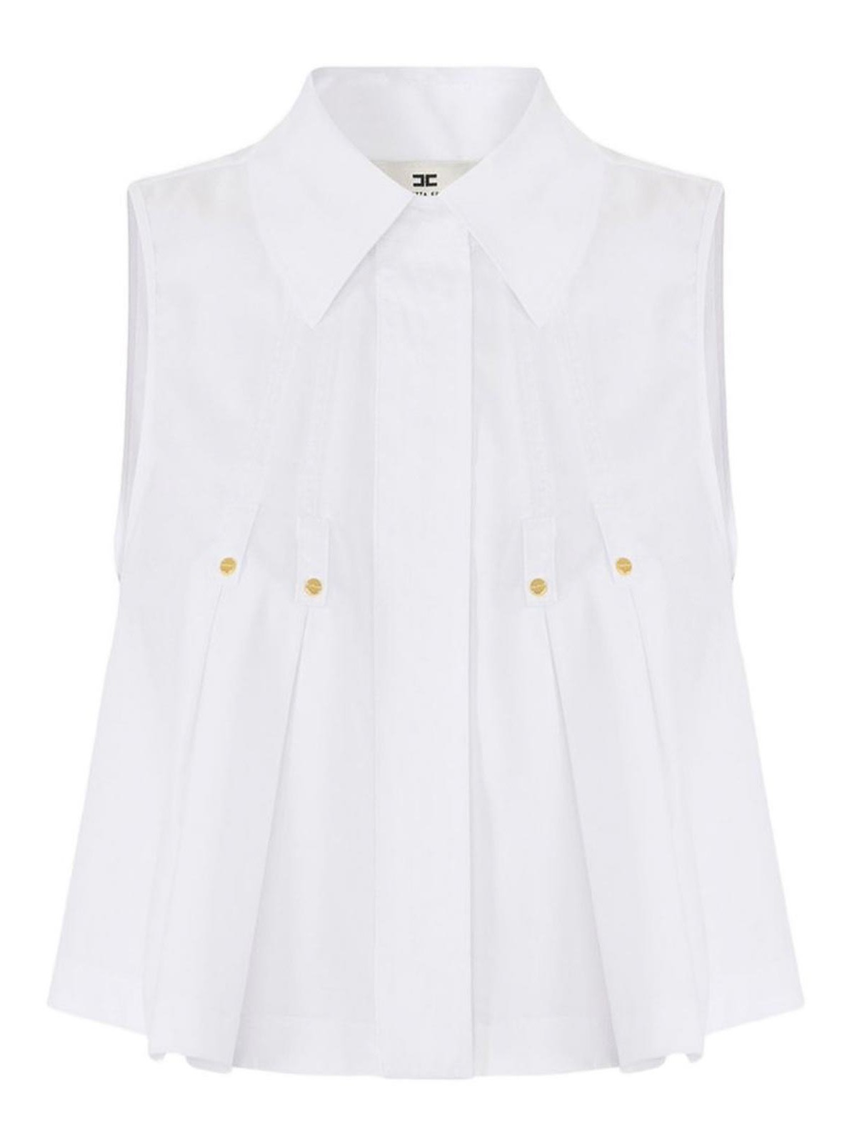 Camicia bianca smanicata in popeline con collo alto e plissettata impreziosita da rivetti in tono, la parte posteriore presenta una mezza cintura con logo