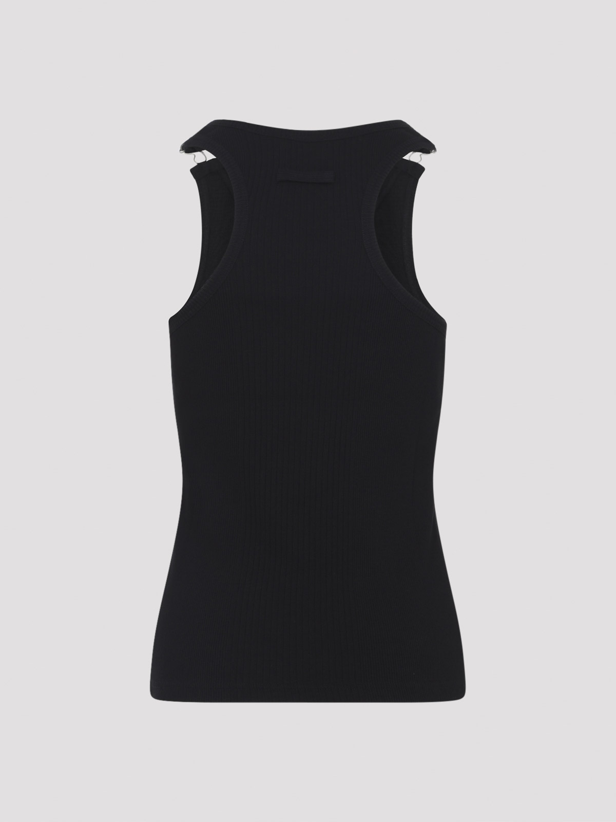 Canotta Jean Paul Gaultier in cotone nero. realizzato in cotone nero con coste che si estendono dai lati al davanti, caratterizzato da scollo rotondo, fibbie in metallo argentato sulle spalline e orlo dritto.