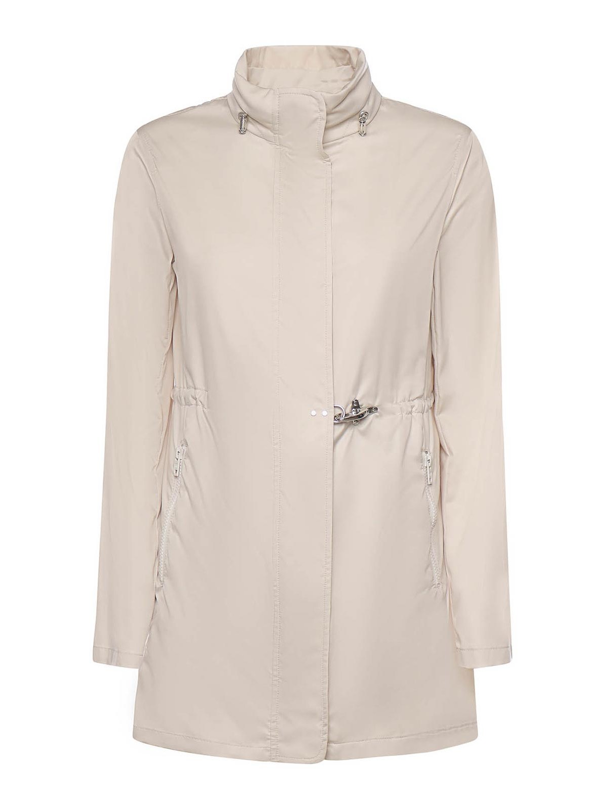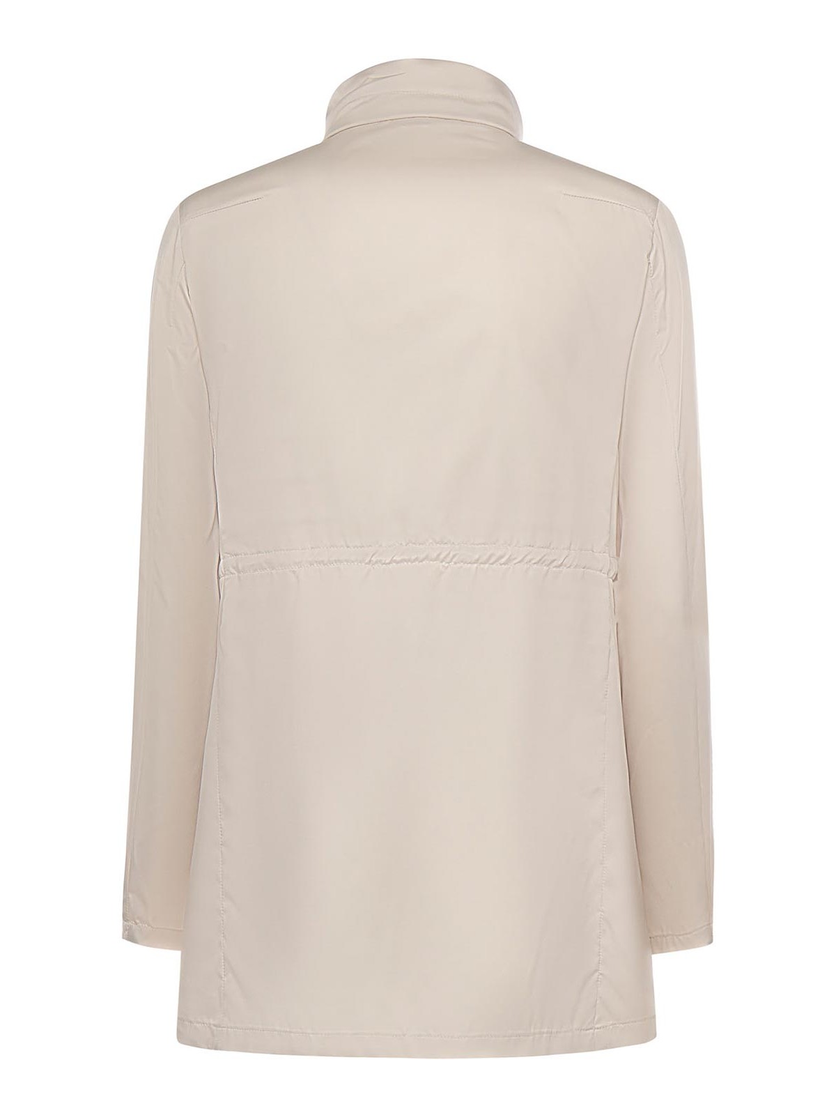 realizzato in tessuto tecnico, chiusura con zip, automatico e gancio, collo alto, vestibilità regolare, la taglia indicata è xs, made in Italy, colore panna