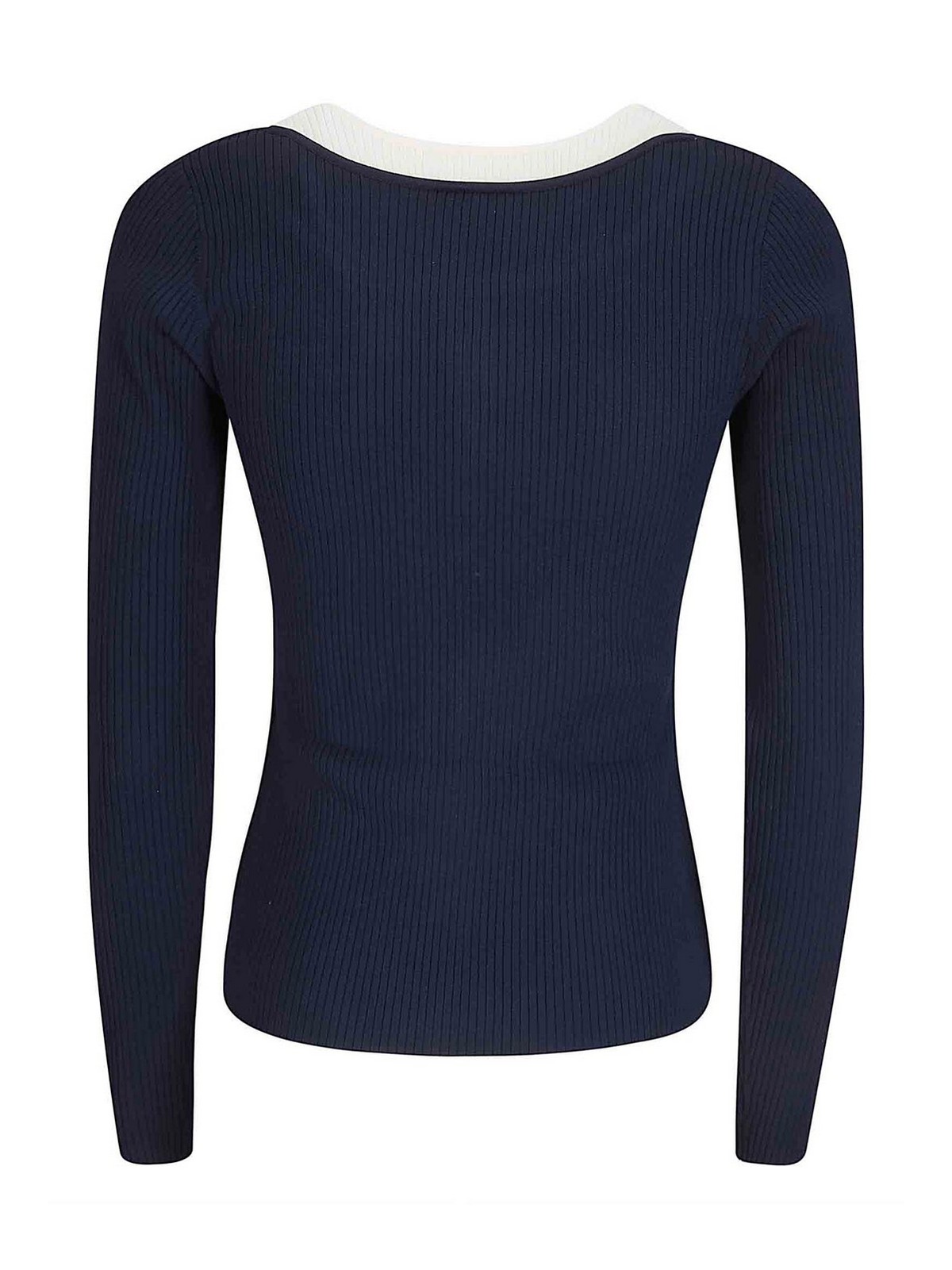 Top in tessuto a costine, slim fit, collo ampio con contrasto bianco.