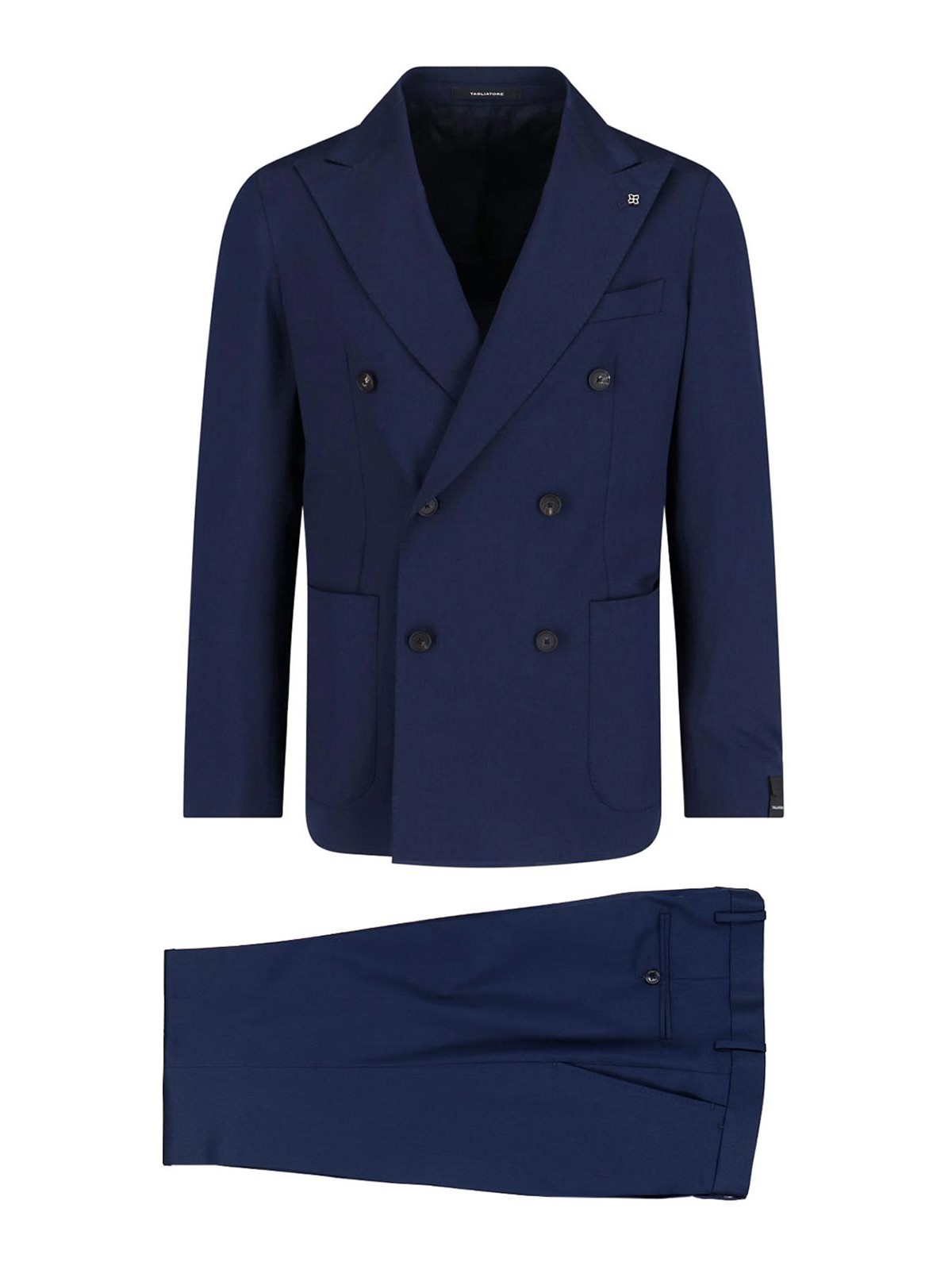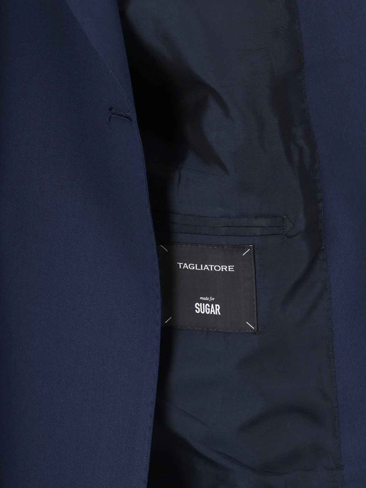 Completo doppiopetto tagliatore, realizzato in esclusiva per sugar, in misto lana vergine blu, scollo a v, revers a lancia, chiusura bottoni doppiopetto fronte, due tasche patta fronte, orlo dritto, pantaloni sartoriali, chiusura zip e gancio, due tasche filetto retro, gamba dritta.