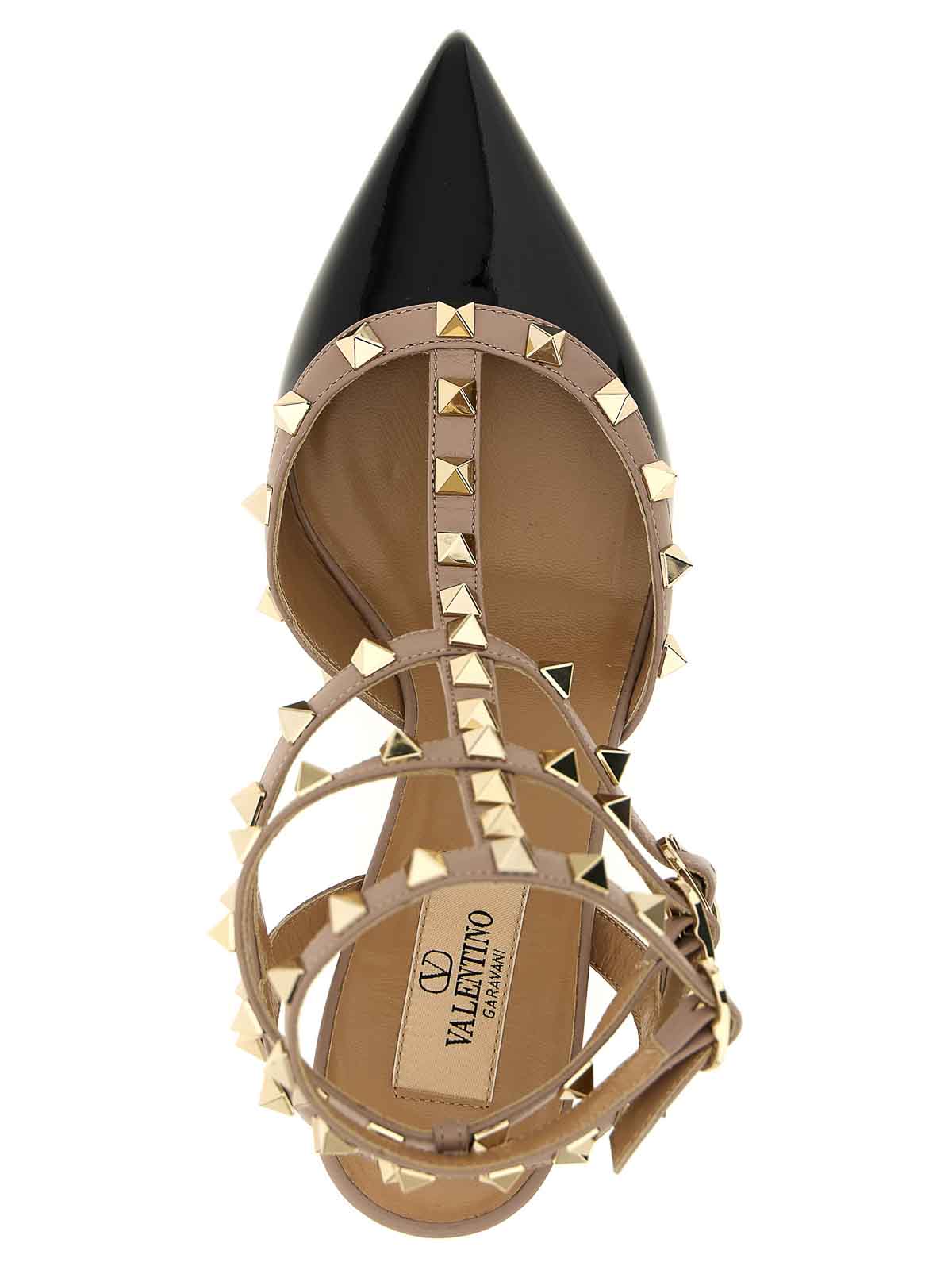 Décolleté 'rockstud' in vernice, cinturini regolabili e profili a contrasto in nappa con applicazioni di borchie metalliche, modello a punta, tacco, fondo in cuoio.