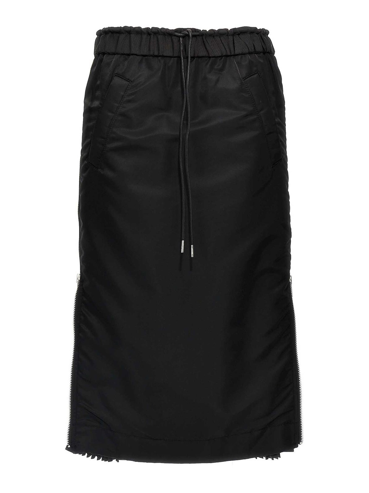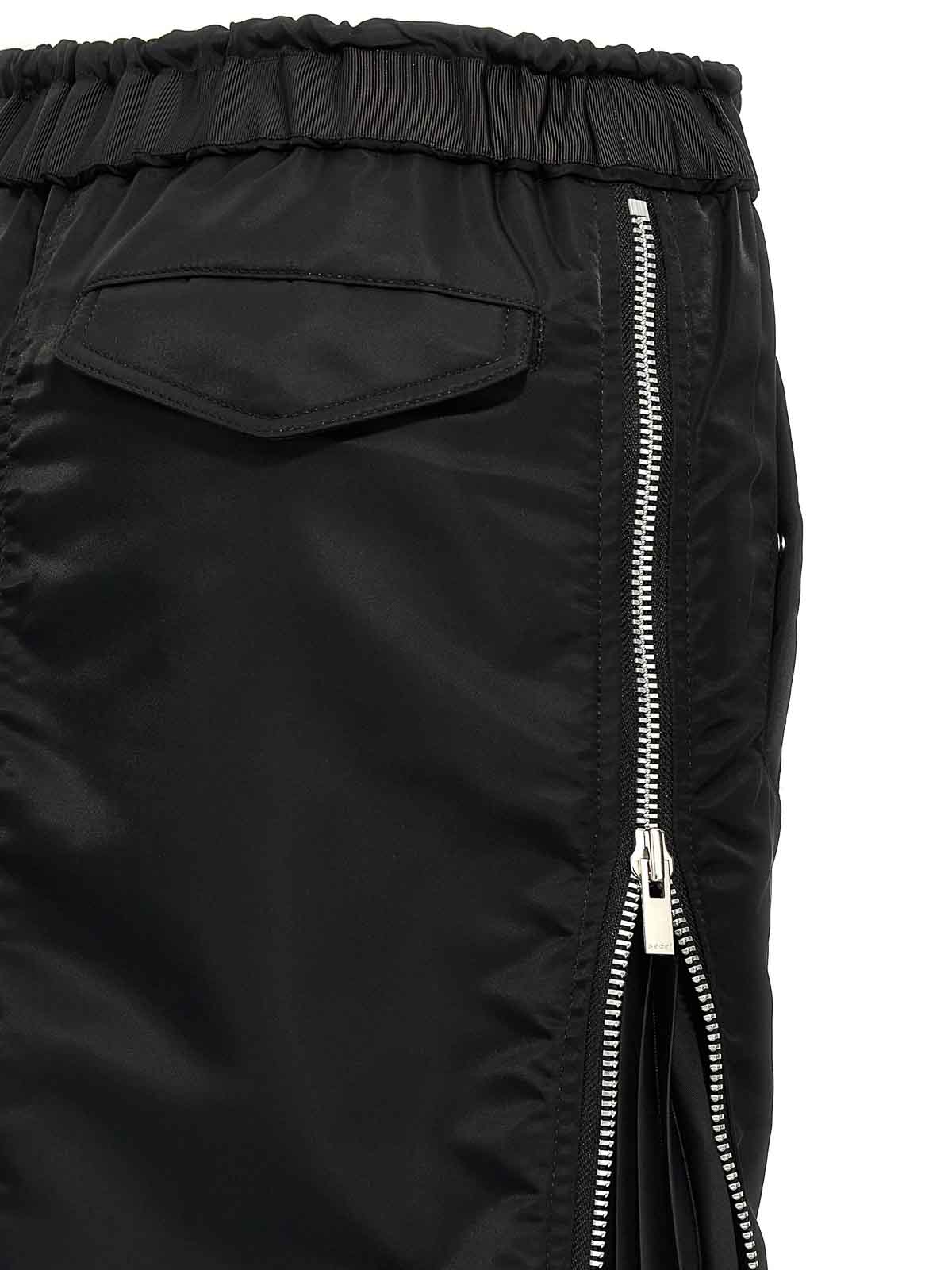 Gonna midi in twill di nylon, inserti laterali plissettati tono su tono con chiusura zip, tasche ed elastico regolabile con coulisse in vita.