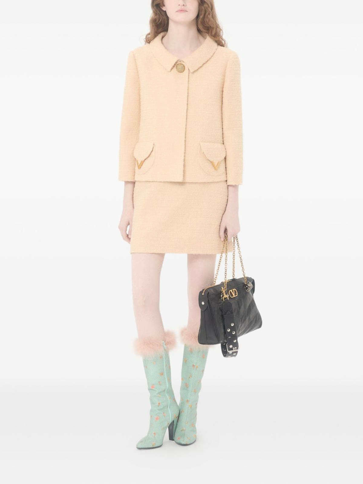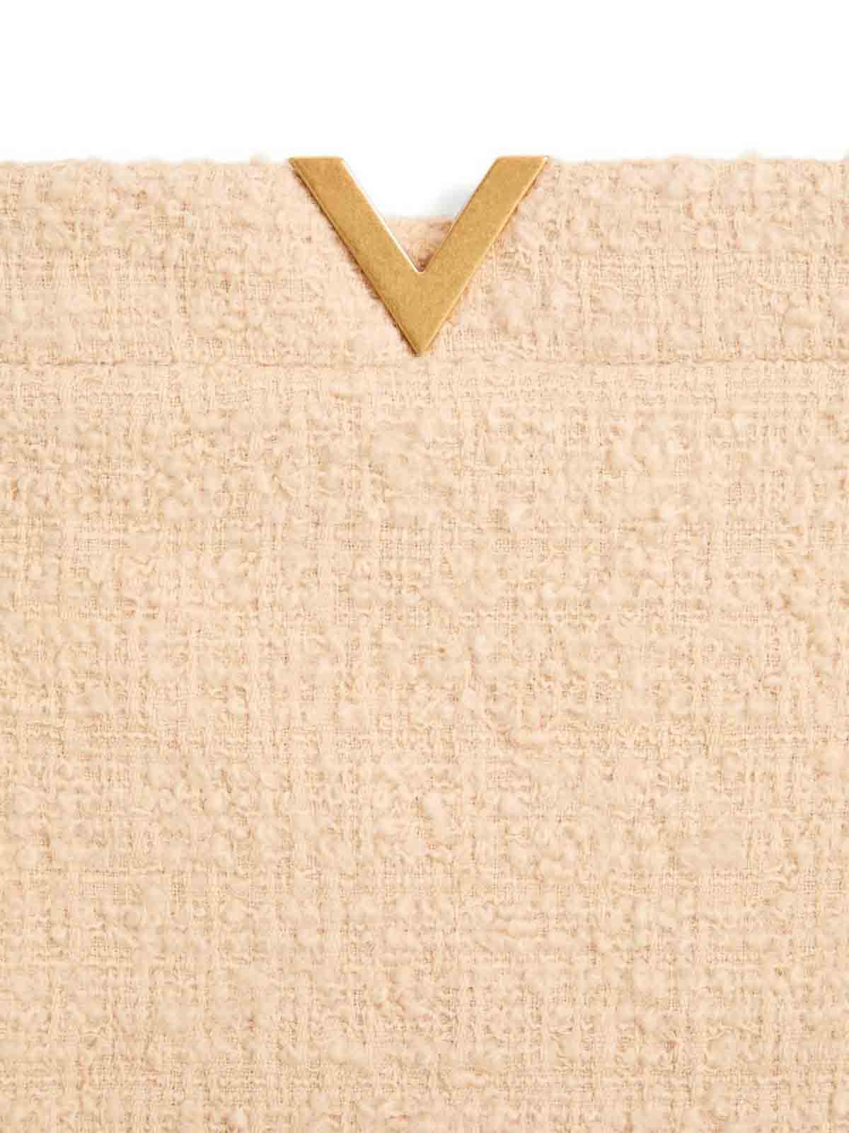 Dettaglio logo v beige chiusura con zip laterale chiusura con gancetto