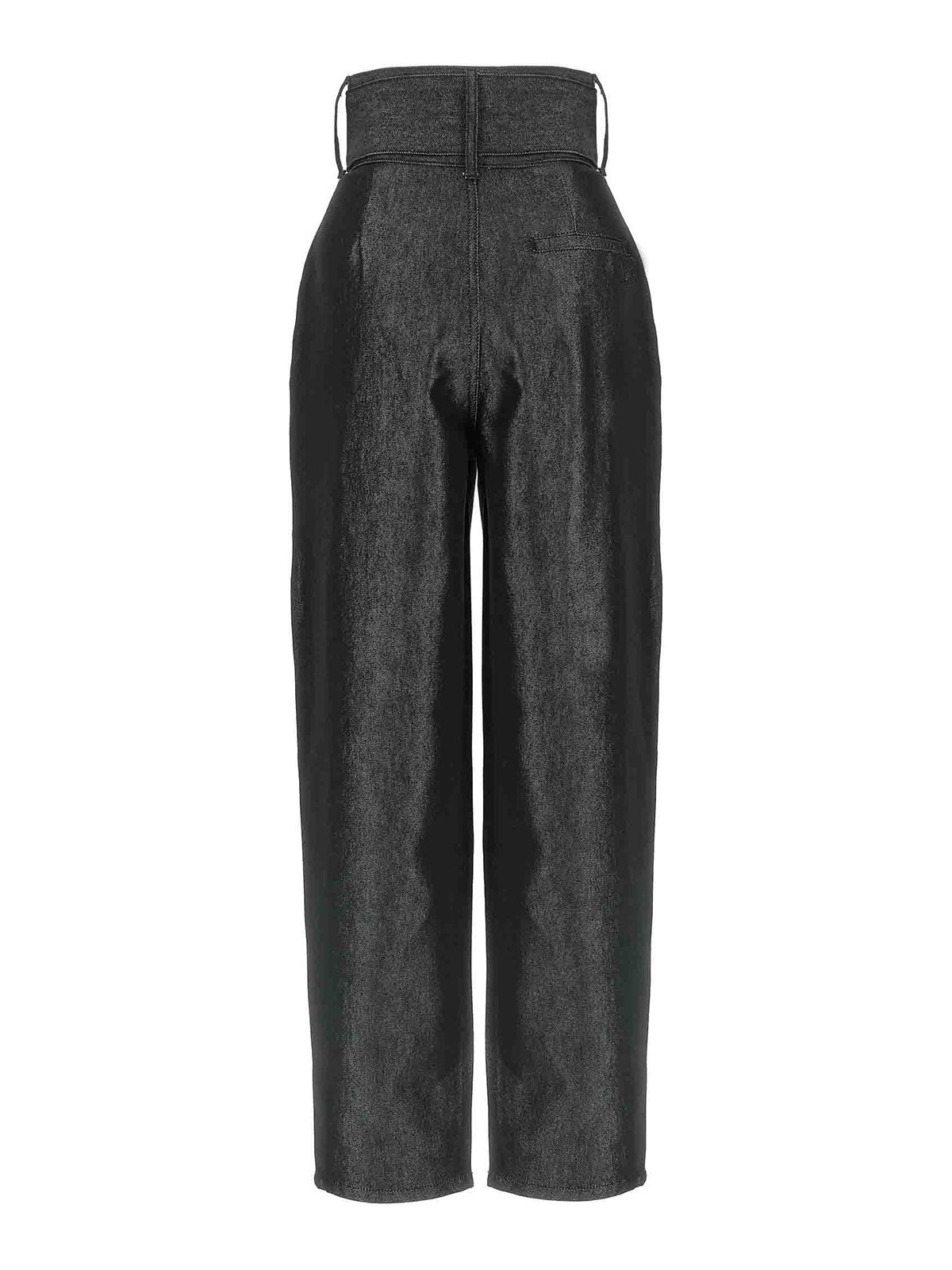 Jeans in denim di cotone rigido tinto in capo, vita alta, spille, chiusura con zip con gancio e bottone, tasche, gamba ampia sulla coscia, cintura removibile.