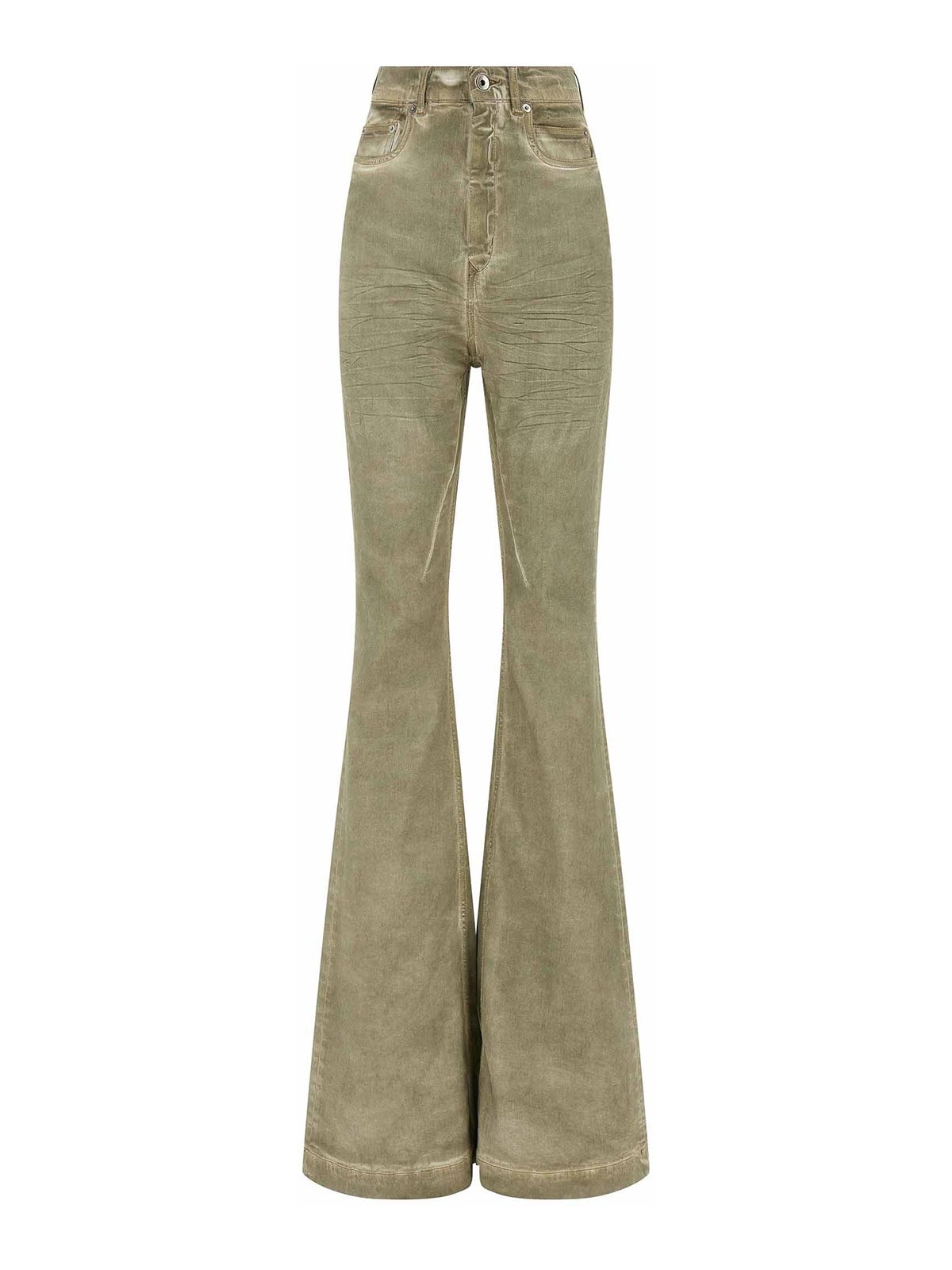 Jeans bolan bootcut a vita alta in denim di cotone stretch con gamba svasata, cinque tasche, chiusura con zip e bottone frontale. poiché la lamina, a fine lavorazione, viene pressata sopra il capo per creare un tocco ceroso, ogni pezzo avrà un aspetto unico e si piegherà, in quanto la lamina si attaccherà in punti diversi a seconda del capo.