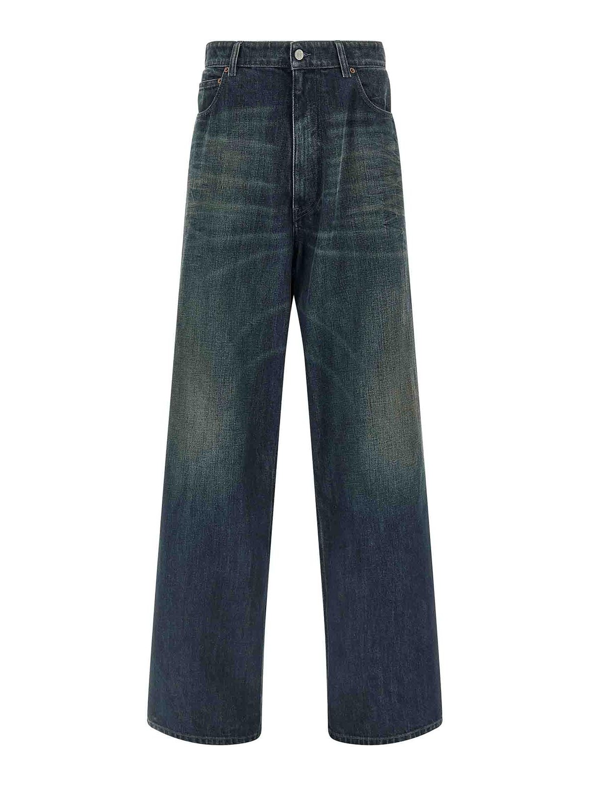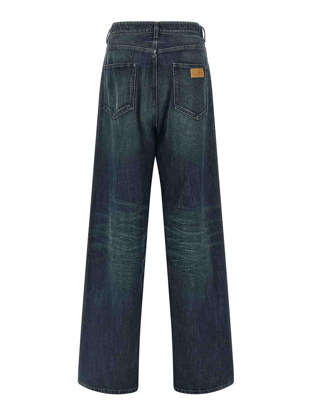 Jeans in denim di cotone rigido stone wash con gamba ampia e dritta, vita regolare, chiusura frontale con zip e bottone, cinque tasche, patch 'firma numerica mm6' e 'linea punto bianco' dietro.
