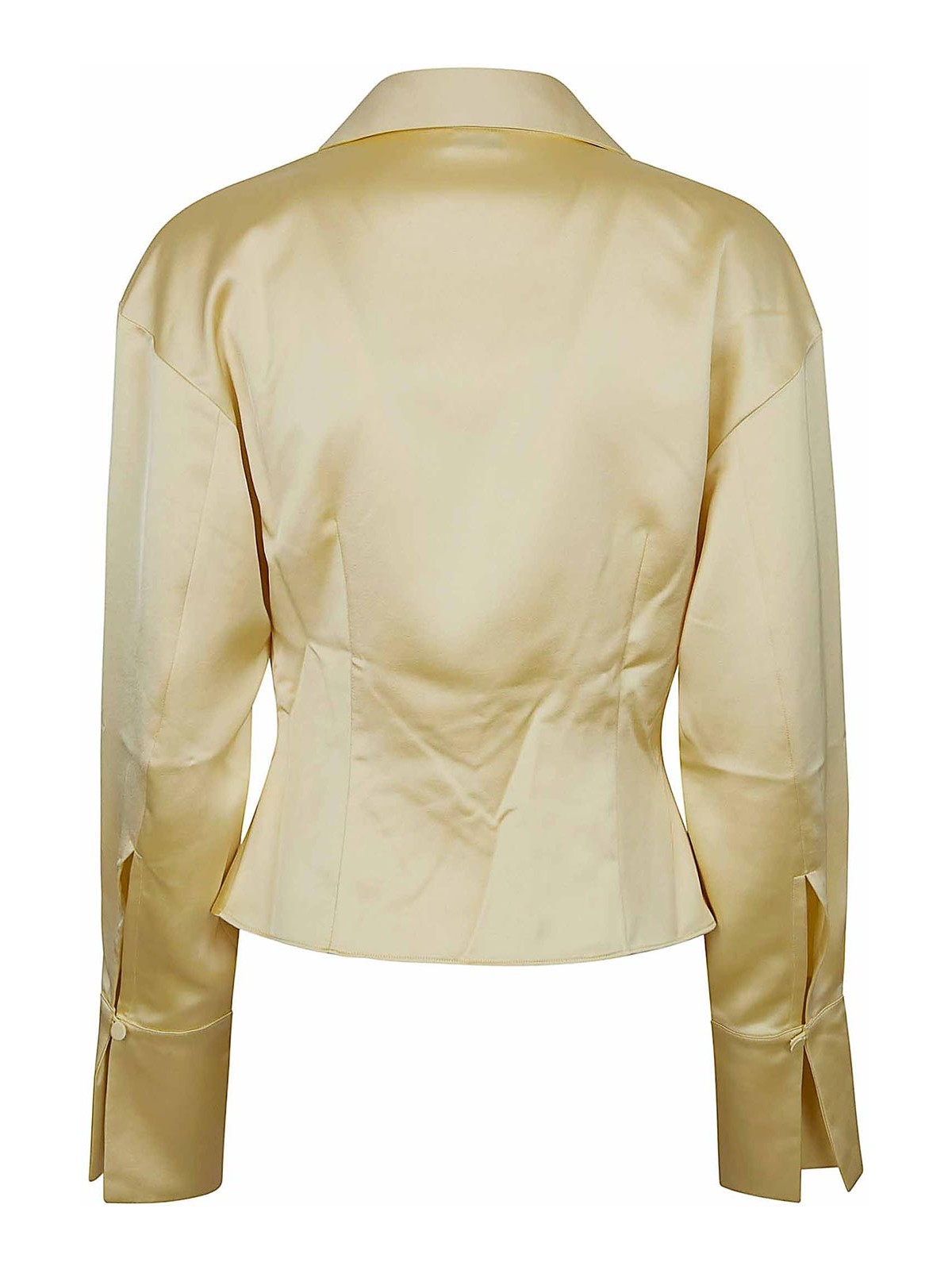 Blusa lilia in raso di the andamane profondo scollo a v incrociato da colletto ampio maniche lunghe con polsini lunghi abbottonati che sottolineano i polsi pinces sul retro che definiscono la silhouette