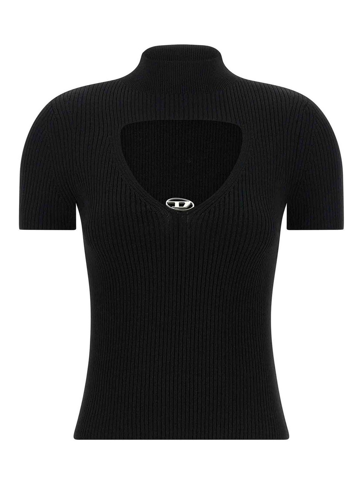 Top in lana stretch a coste 'm-olive' con collo a lupetto, cut-out frontale con applicazione di ovale in metallo, maniche corte.