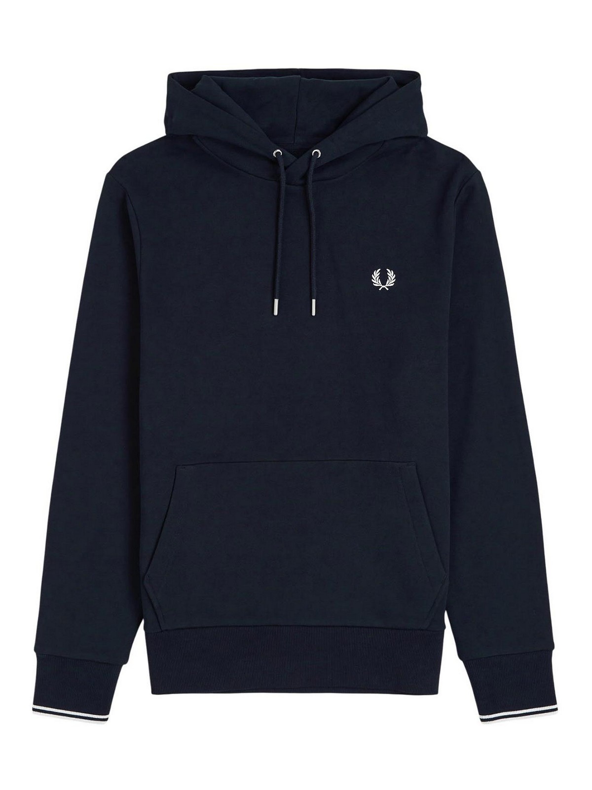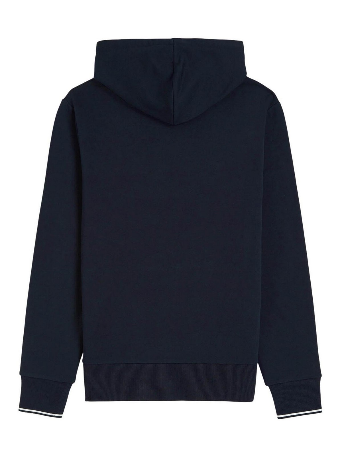 Fred perry felpa con cappuccio e doppia riga blu felpa con cappuccio realizzata in cotone french terry, caratterizzata dalliconica doppia riga sui polsini, elemento distintivo del dna fred perry. la struttura in tessuto felpato garantisce comfort e morbidezza, mantenendo una linea sportiva e contemporanea. il design completato da cappuccio con coulisse regolabile, tasca a marsupio e finiture a coste su fondo e polsini. la corona dalloro ricamata a contrasto sul petto a sinistra firma il capo con linconfondibile identit del brand. tessuto felpato in cotone french terry cappuccio con coulisse regolabile tasca a marsupio polsini con doppia riga iconica orlo e polsini a coste corona dalloro ricamata sul petto a sinistra vestibilita' regular, composizione tessuto: 100% cotone, istruzioni di lavaggio lavare in lavatrice