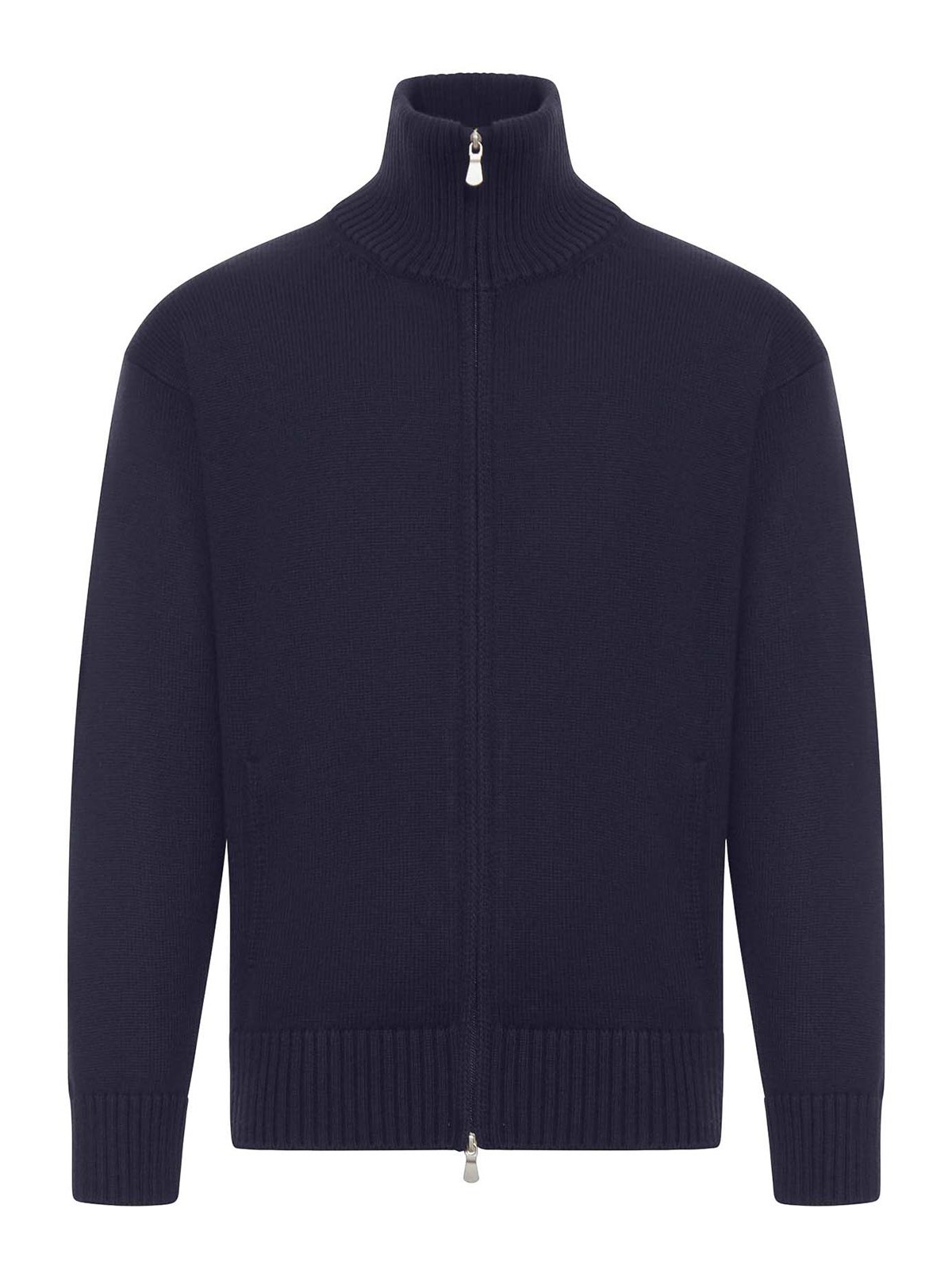 Cardigan in lana merino 3 capi, vestibilità comoda, collo a lupetto, collo, polsi e fondo a costine, chiusura con zip a doppio cursore, tasche laterali a filo, colore: blu navy