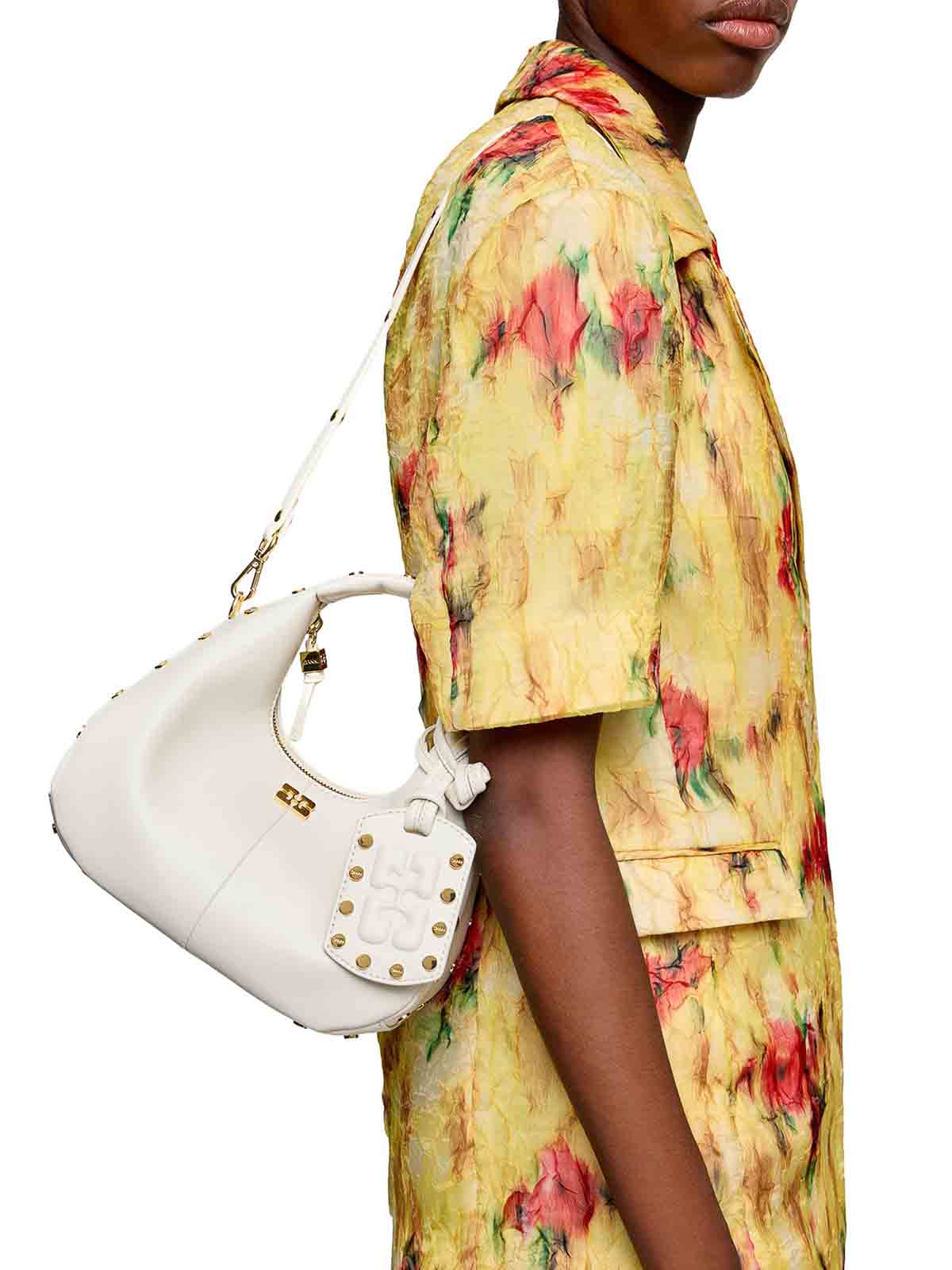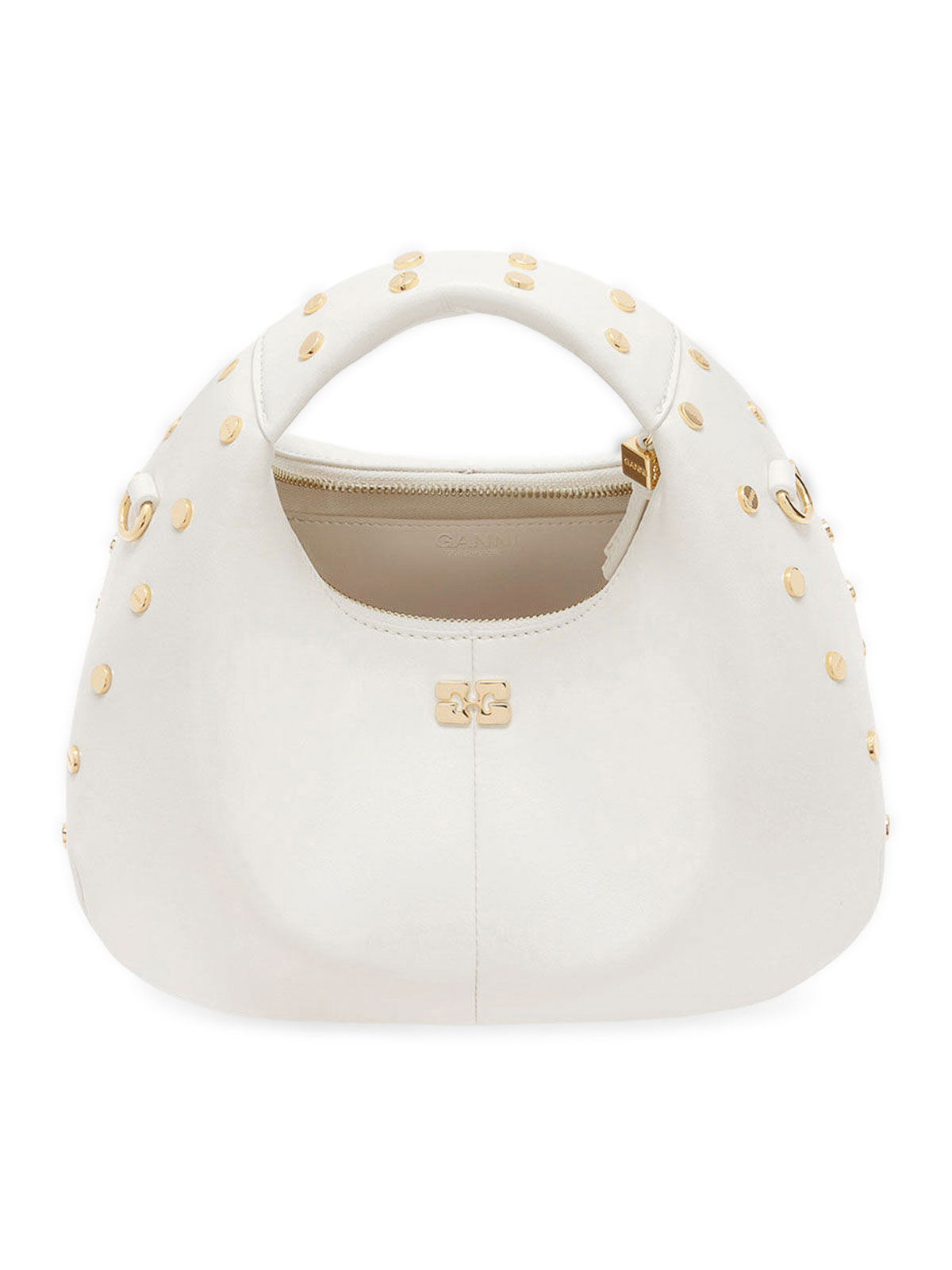 finitura in pelle di agnello, borchie, manico superiore, tracolla removibile, logo Ganni Butterfly, logo Ganni in rilievo sul retro della borsa, chiusura con zip, dadi in metallo incisi con logo Ganni Butterfly, etichette specchiate, uno scomparto, tasca piatta per carte all'interno, colore: garzetta