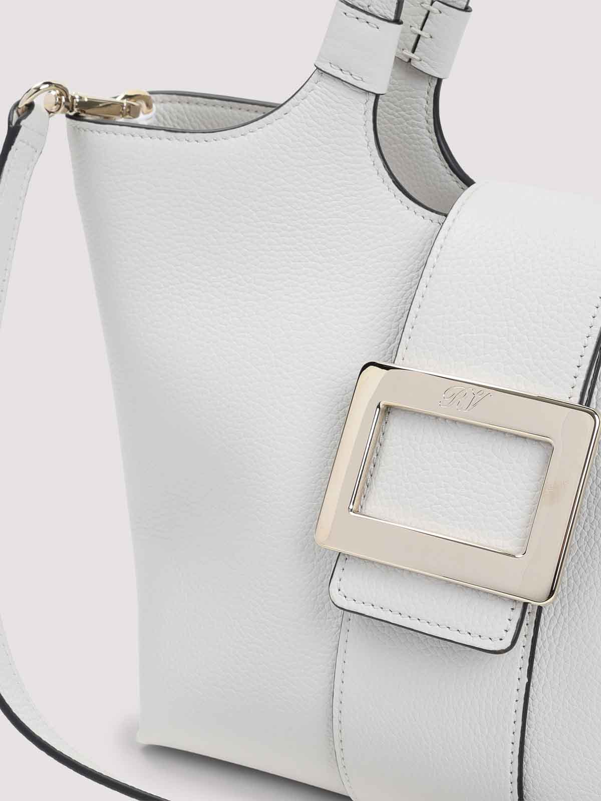 Borsa shopping mini Roger Vivier media in pelle bianco ghiaccio. borsa a tracolla media in pura pelle bianco ghiaccio, manici superiori, tracolla tono su tono sul davanti, fibbia metallica logata frontale color argento, tracolla regolabile e staccabile, uno scomparto principale.