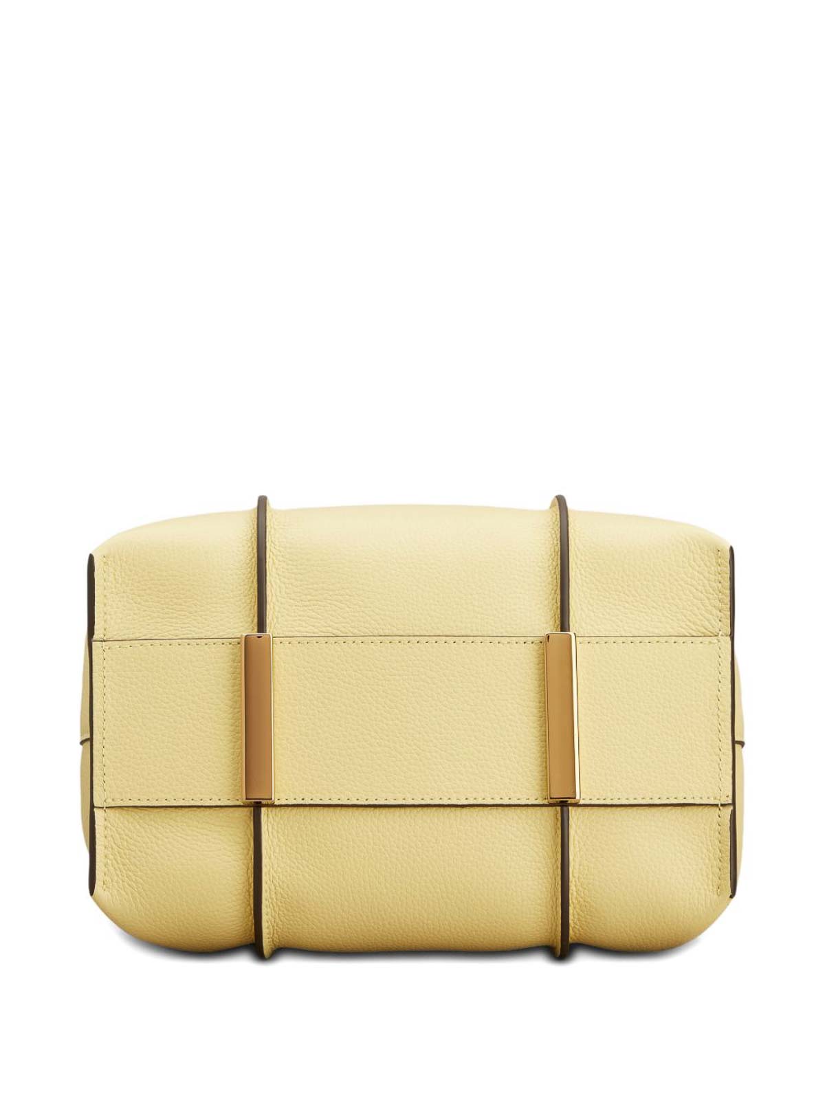 Manico superiore giallo, tracolla regolabile e staccabile, custodia rimovibile, chiusura con bottone a pressione in hardware color oro