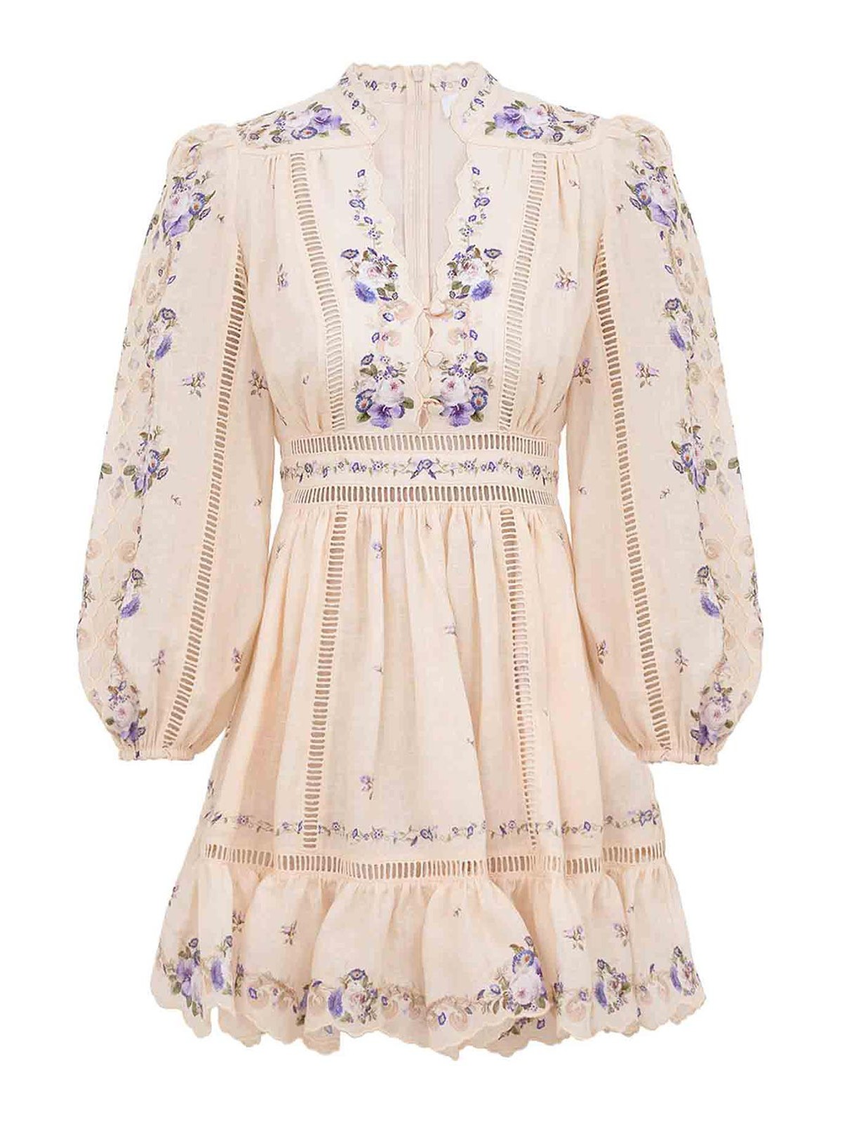 lino, profondo scollo a V, abbottonatura sul busto, fondo smerlato e ricamo all-over, chiusura con cerniera invisibile al centro dietro, colore: panna/rosa/viola