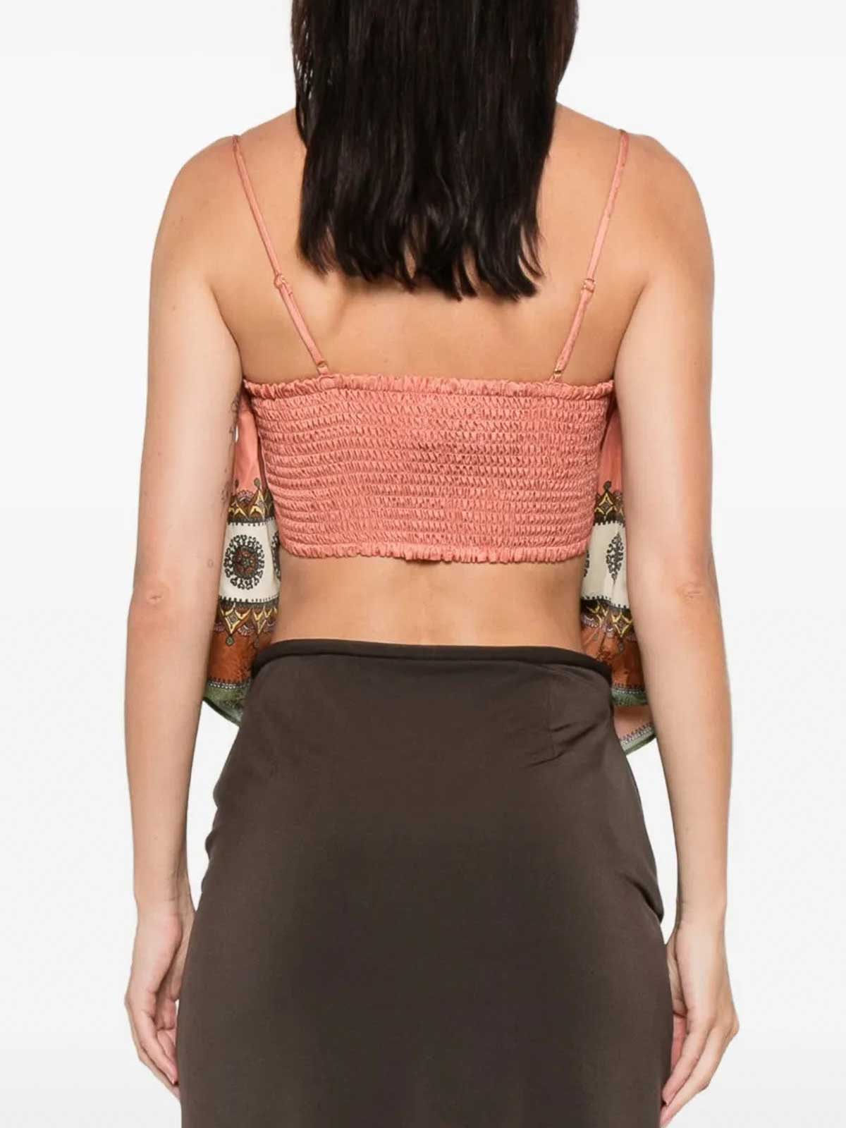 Caratterizzato da scollo quadrato e spalline regolabili, allacciatura posteriore con pannello elastico arricciato.