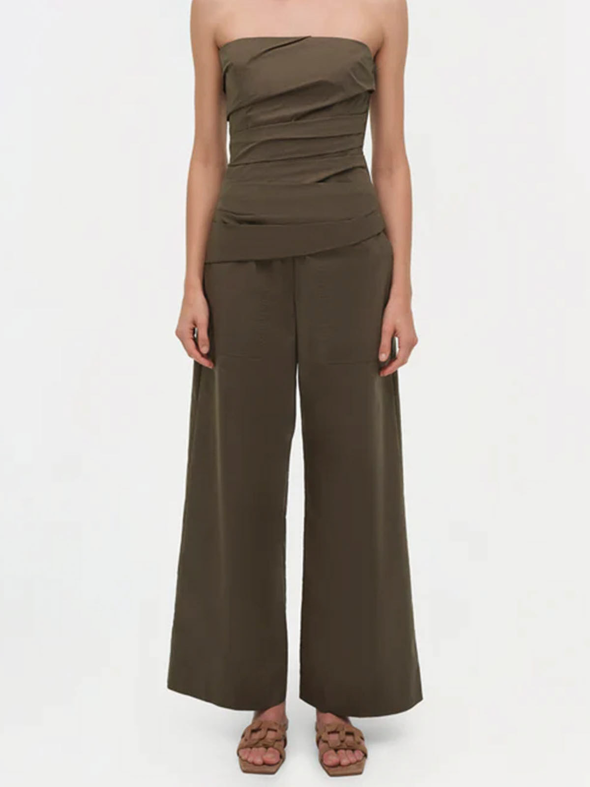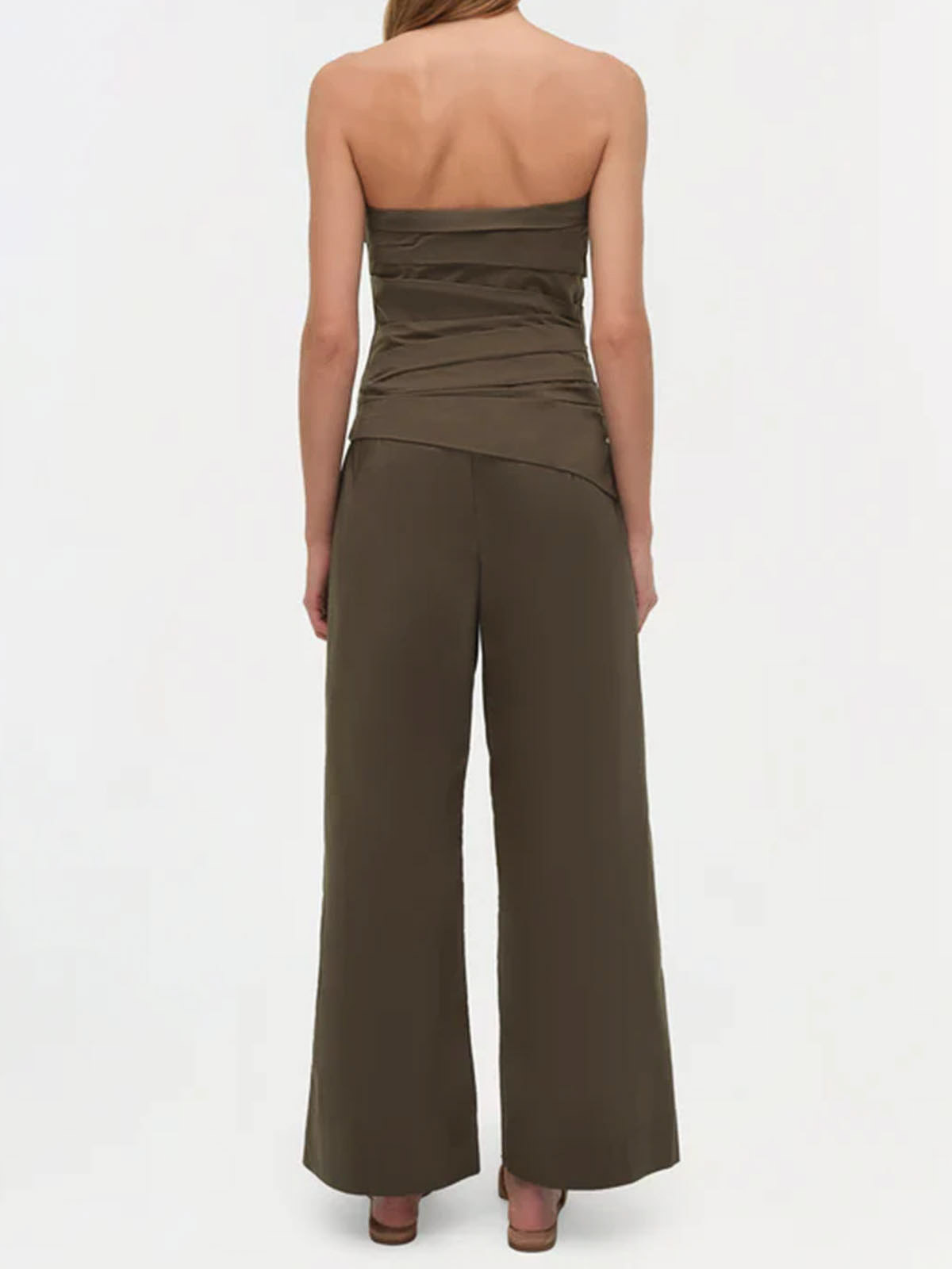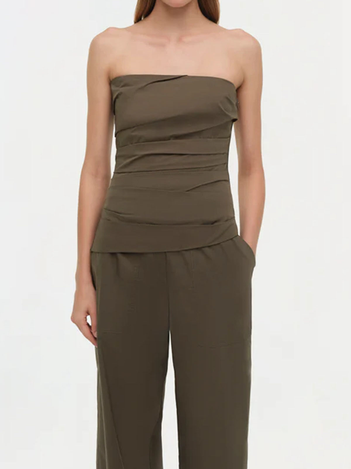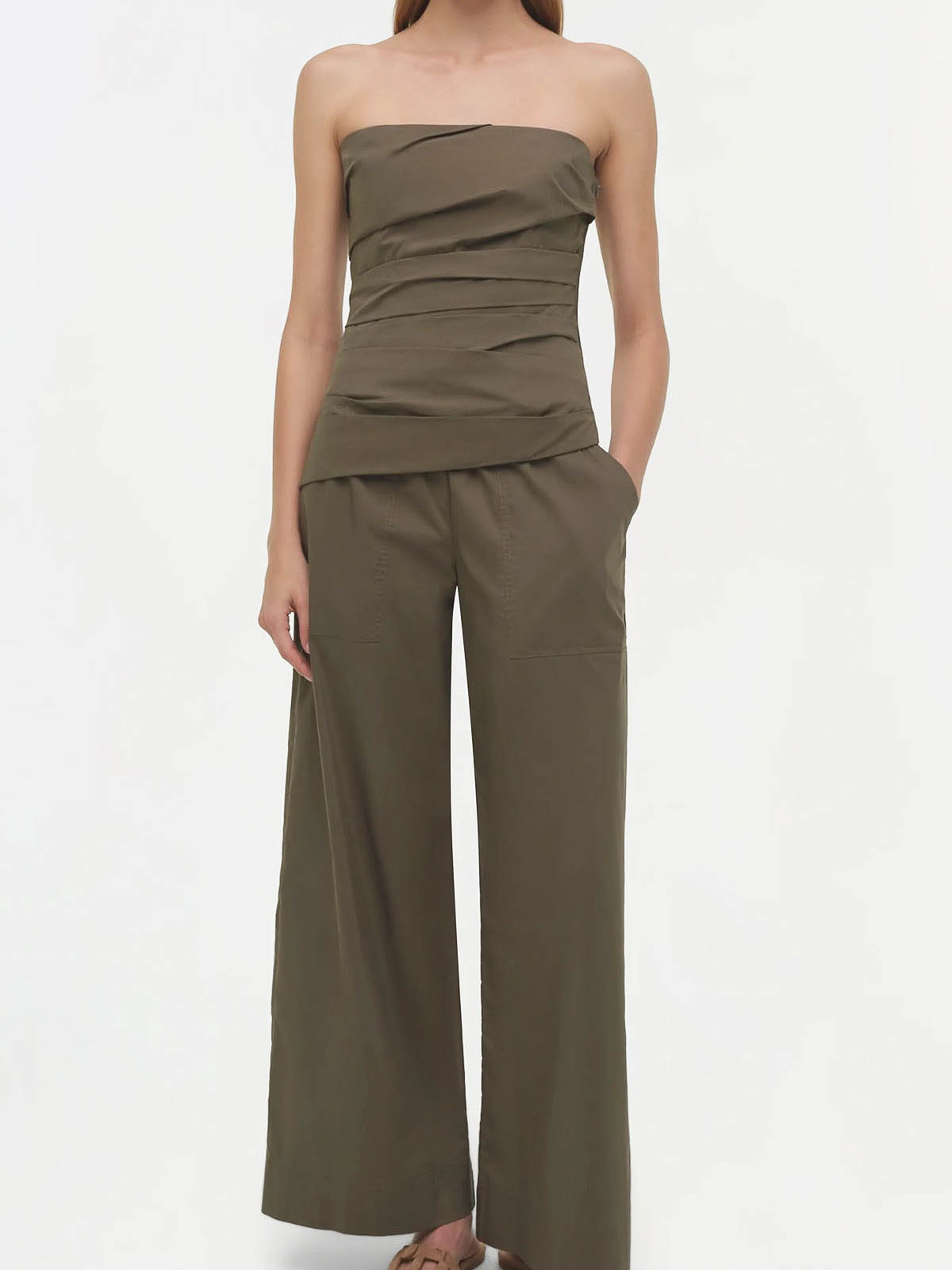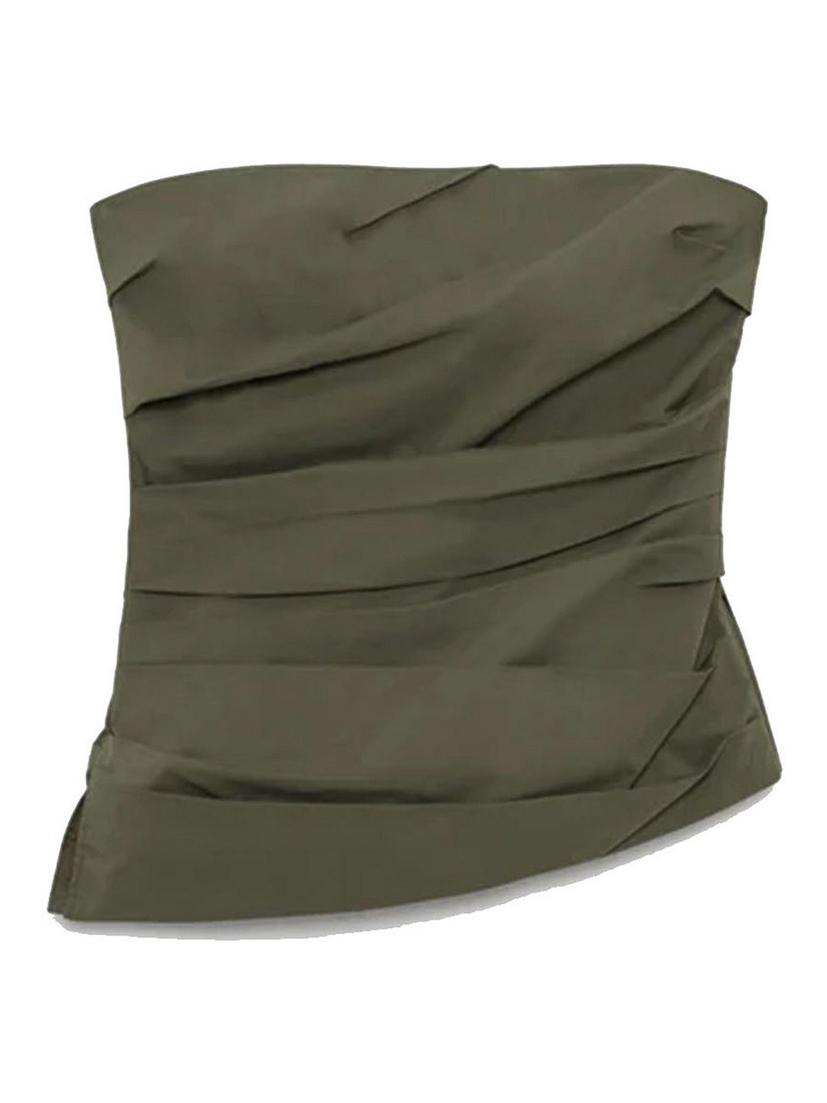 Top verde militare realizzato in fresco popeline di cotone, disegnato con morbide pieghe angolate che creano una vestibilità strutturata e scolpita sul busto. il disossamento interno fornisce un supporto discreto. spallacci sottili regolabili e removibili.