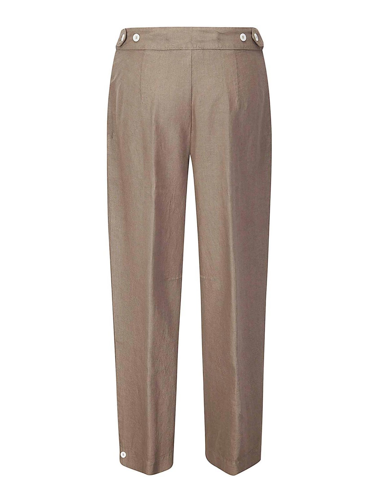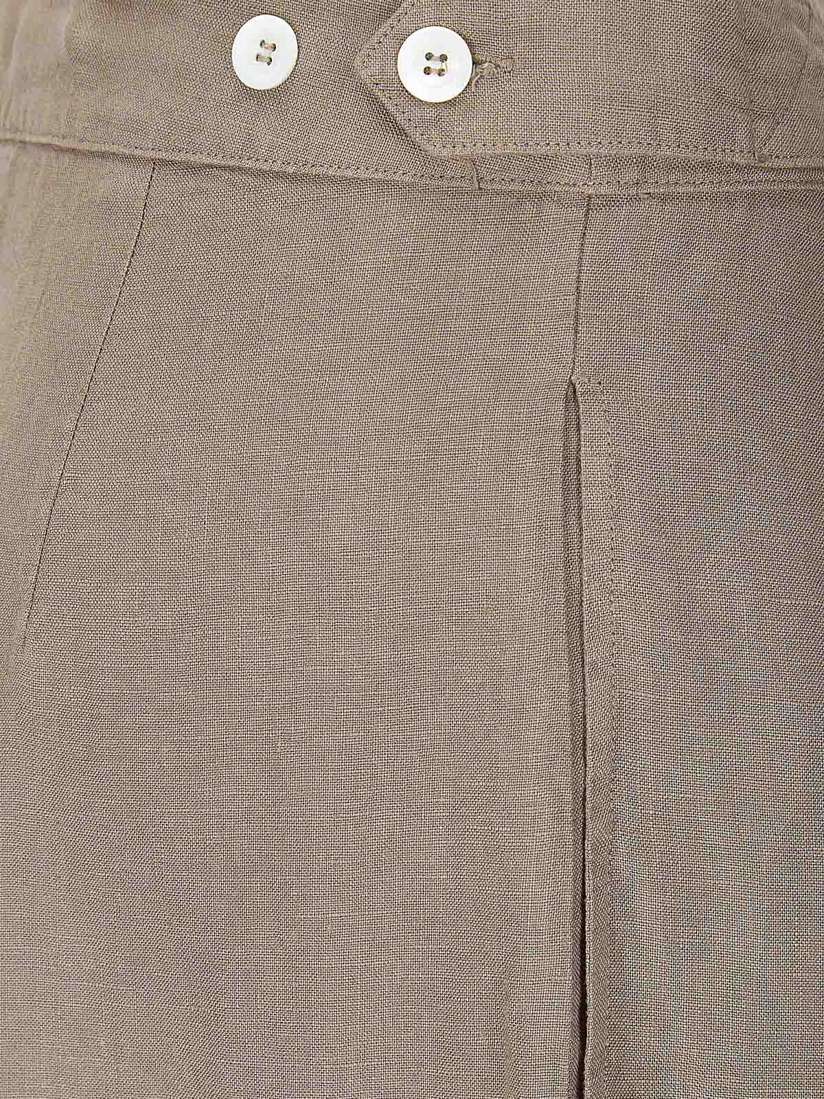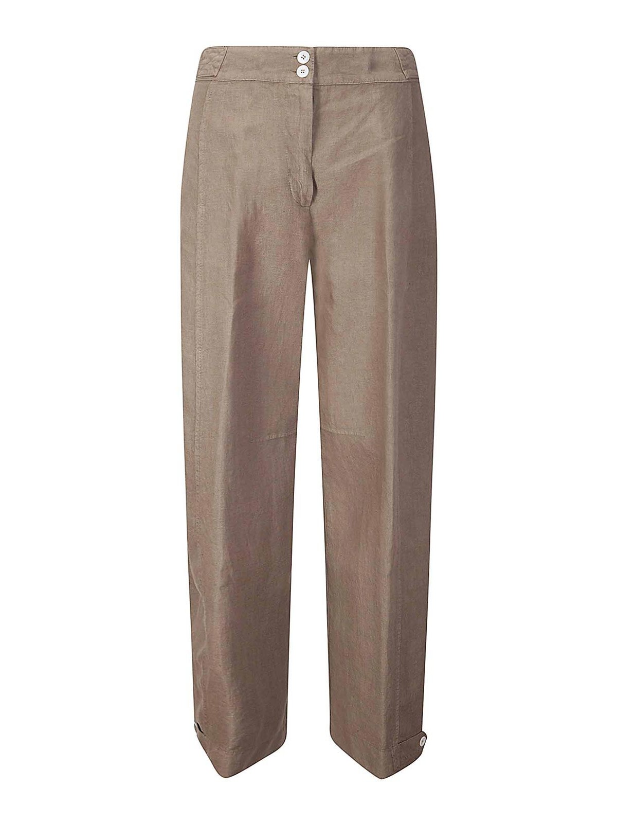 Pantalone in lino, chiusura con zip e bottoni, due tasche laterali a filetto, gamba larga.