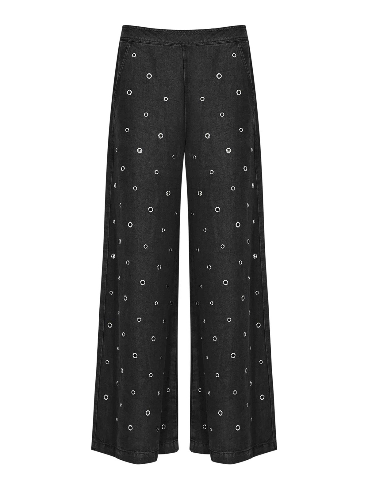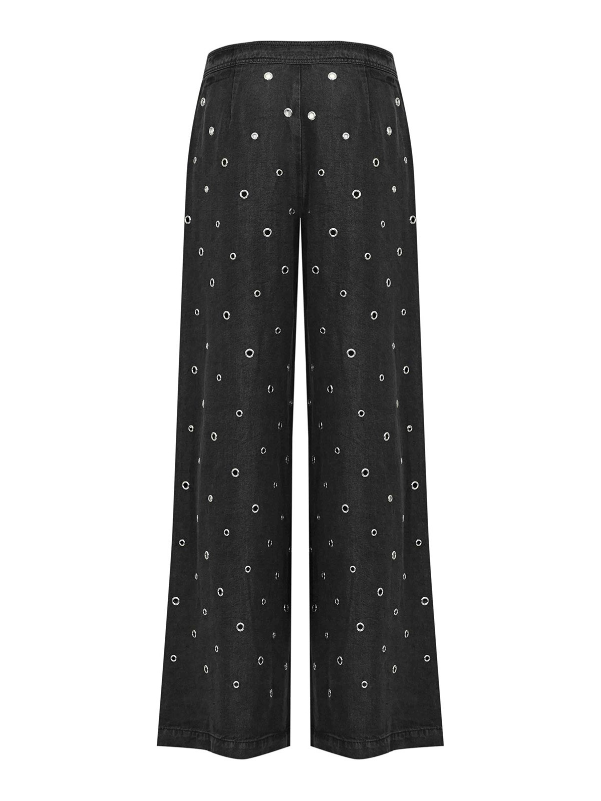 Pantalone stiratrici da donna in denim light black, pinko, modello stiratrici, tessuto: denim, fantasia: tinta unita con borchie applicate, vita: media, chiusura: zip posteriore, tasche: non presenti, lunghezza: lunga, dettagli: borchie metalliche distribuite su tutta la superficie, foderato: no, vestibilità: regolare