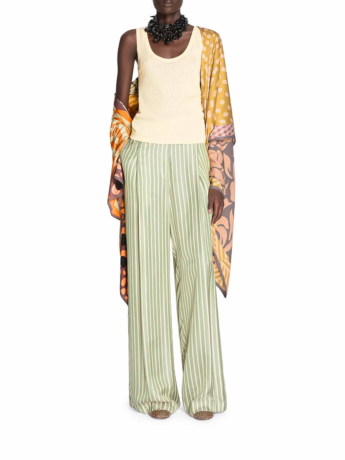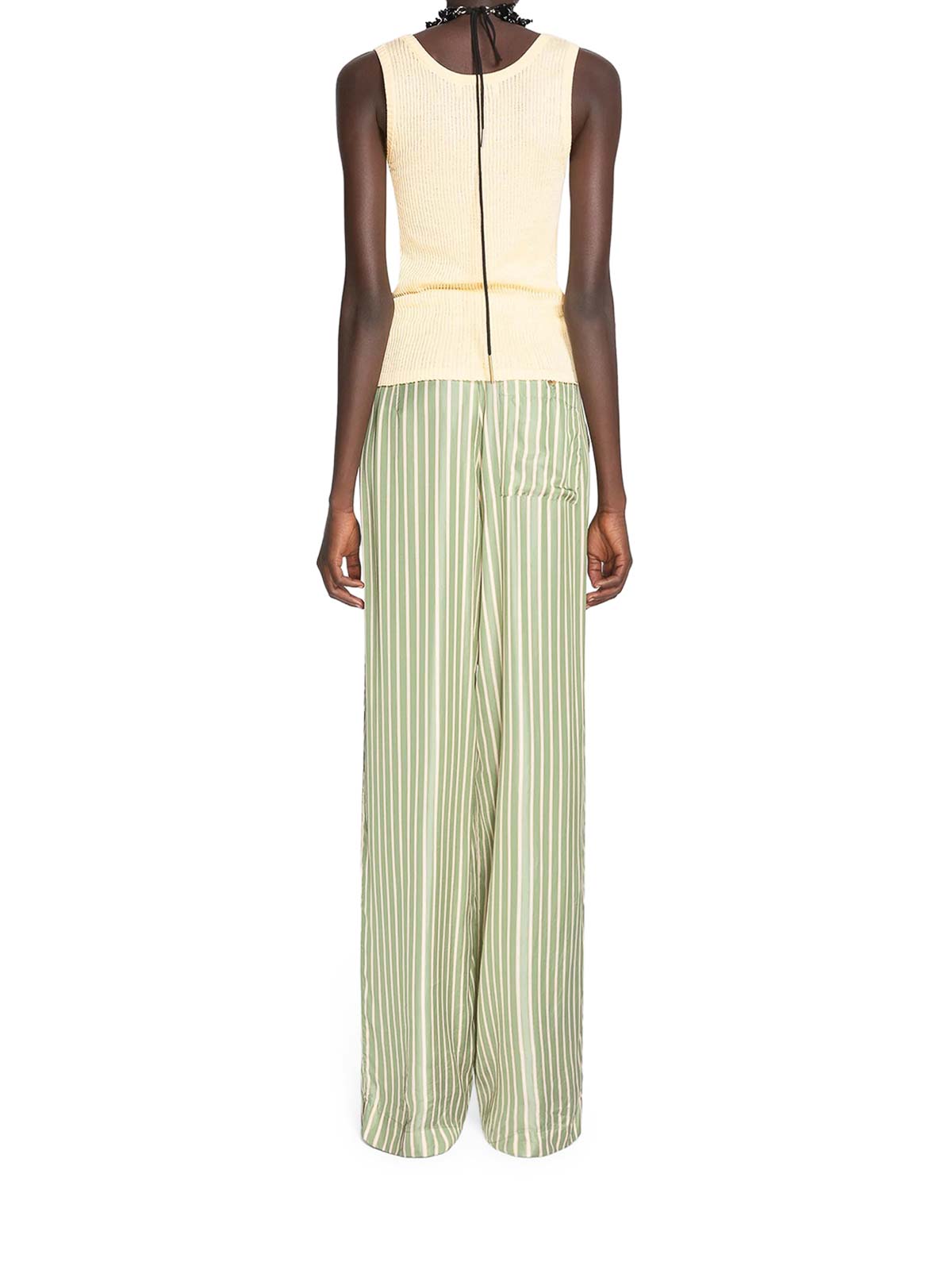 vita alta, gamba ampia con pinces, tasche laterali a fessura e tasca applicata dietro, elastico in vita, vestibilità ampia, colore verde/avorio