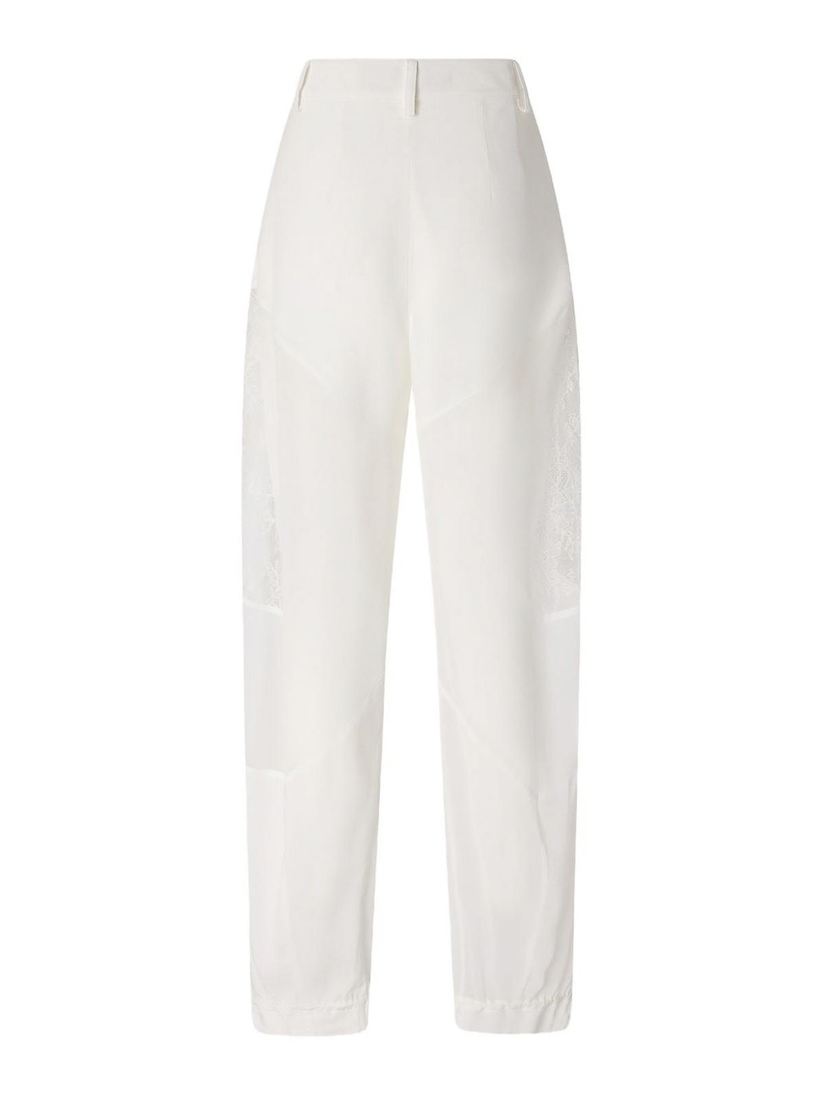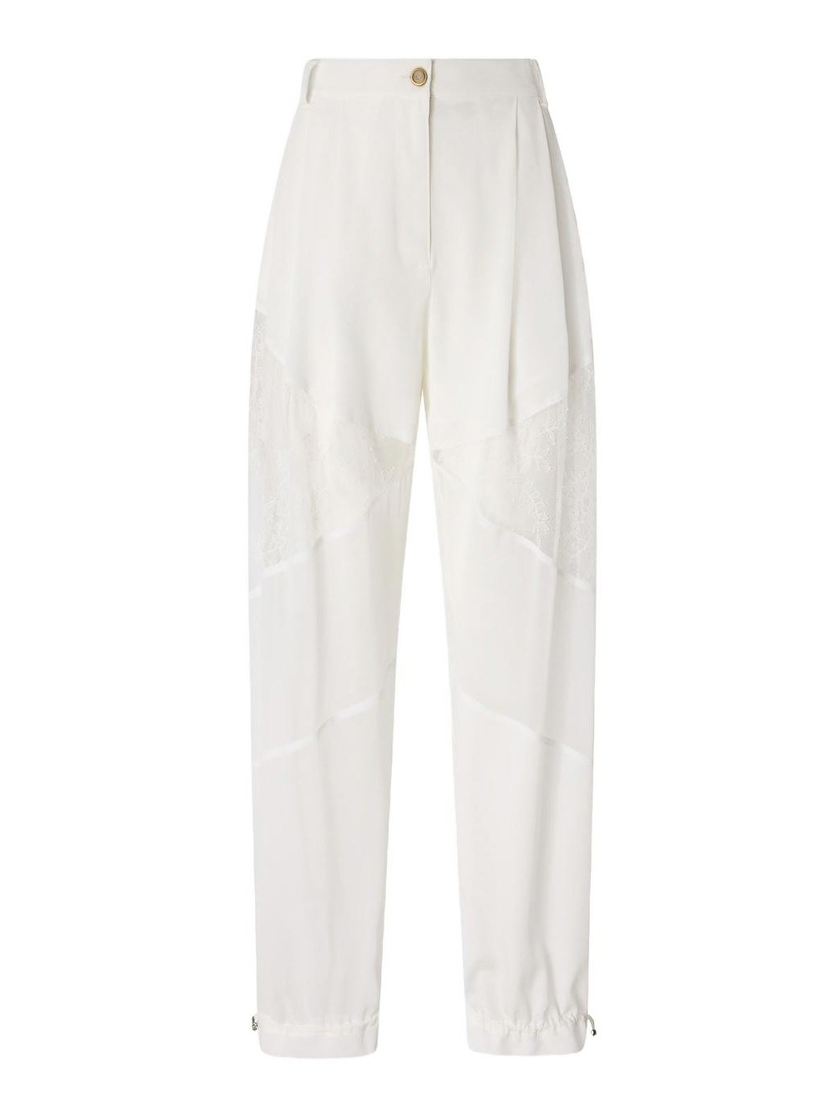 Pantaloni a carota a vita alta bianchi con pannelli in pizzo, patta nascosta e orlo con coulisse di pinko, caratterizzati da una silhouette a carota lusinghiera e orlo regolabile. perfetti per raffinati outfit quotidiani o look casual contemporanei, questi pantaloni combinano eleganza femminile, comfort e dettagli raffinati