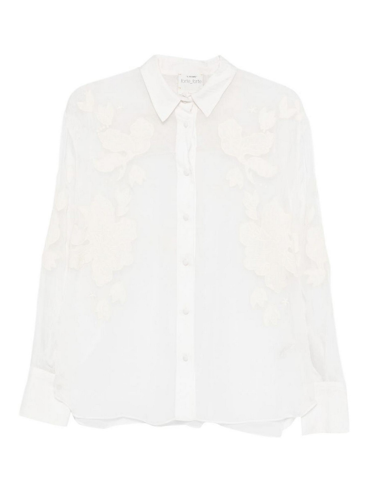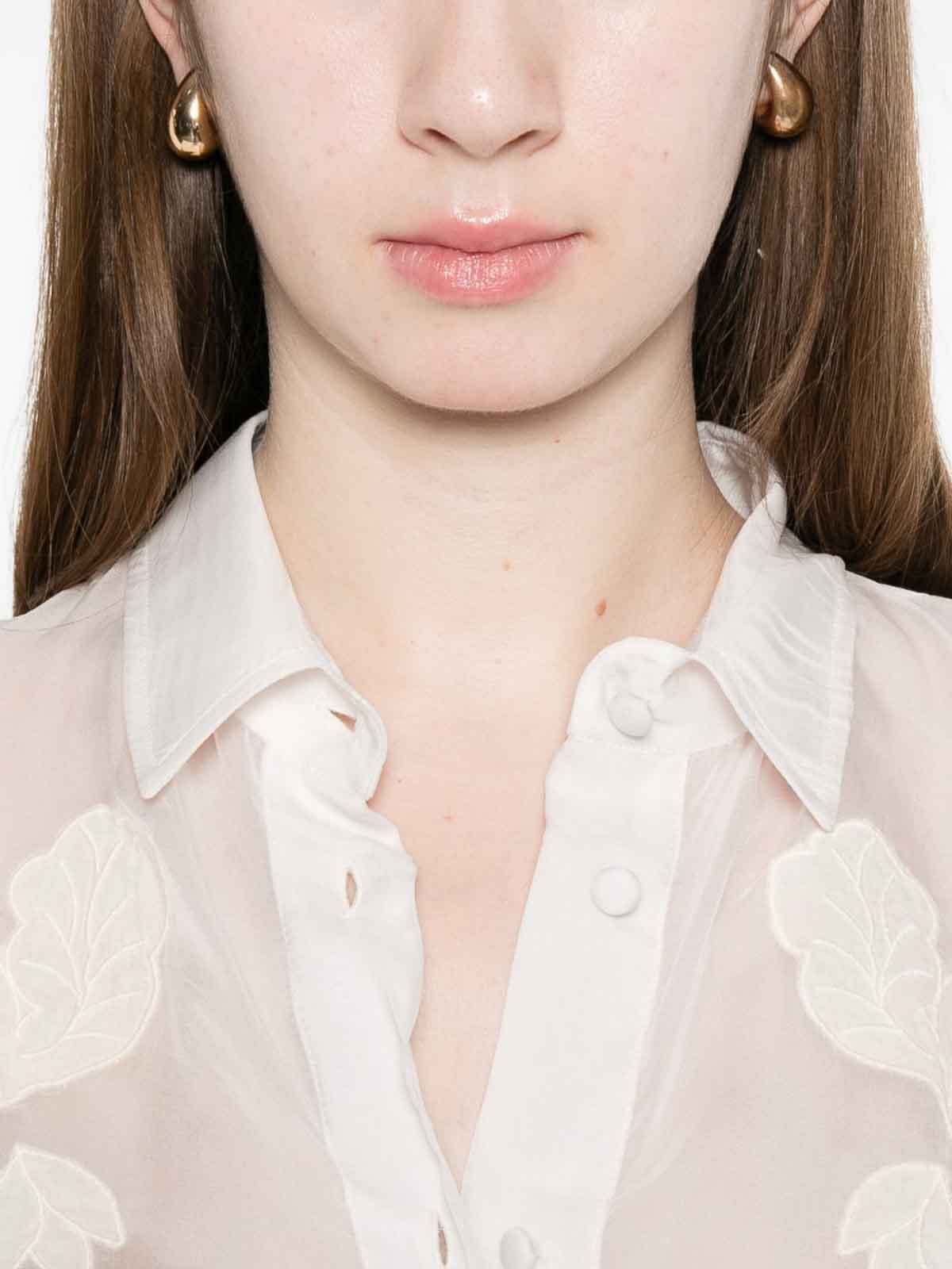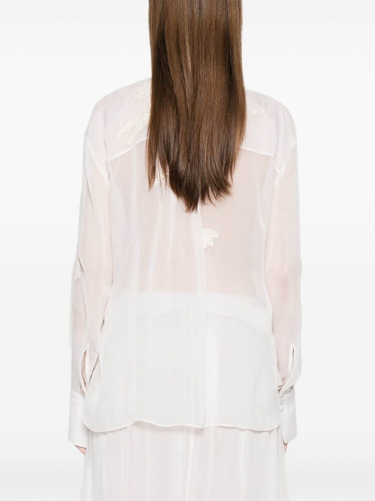 Chiusura con bottoni dal design floreale avorio, colletto classico, maniche lunghe, polsini con bottoni