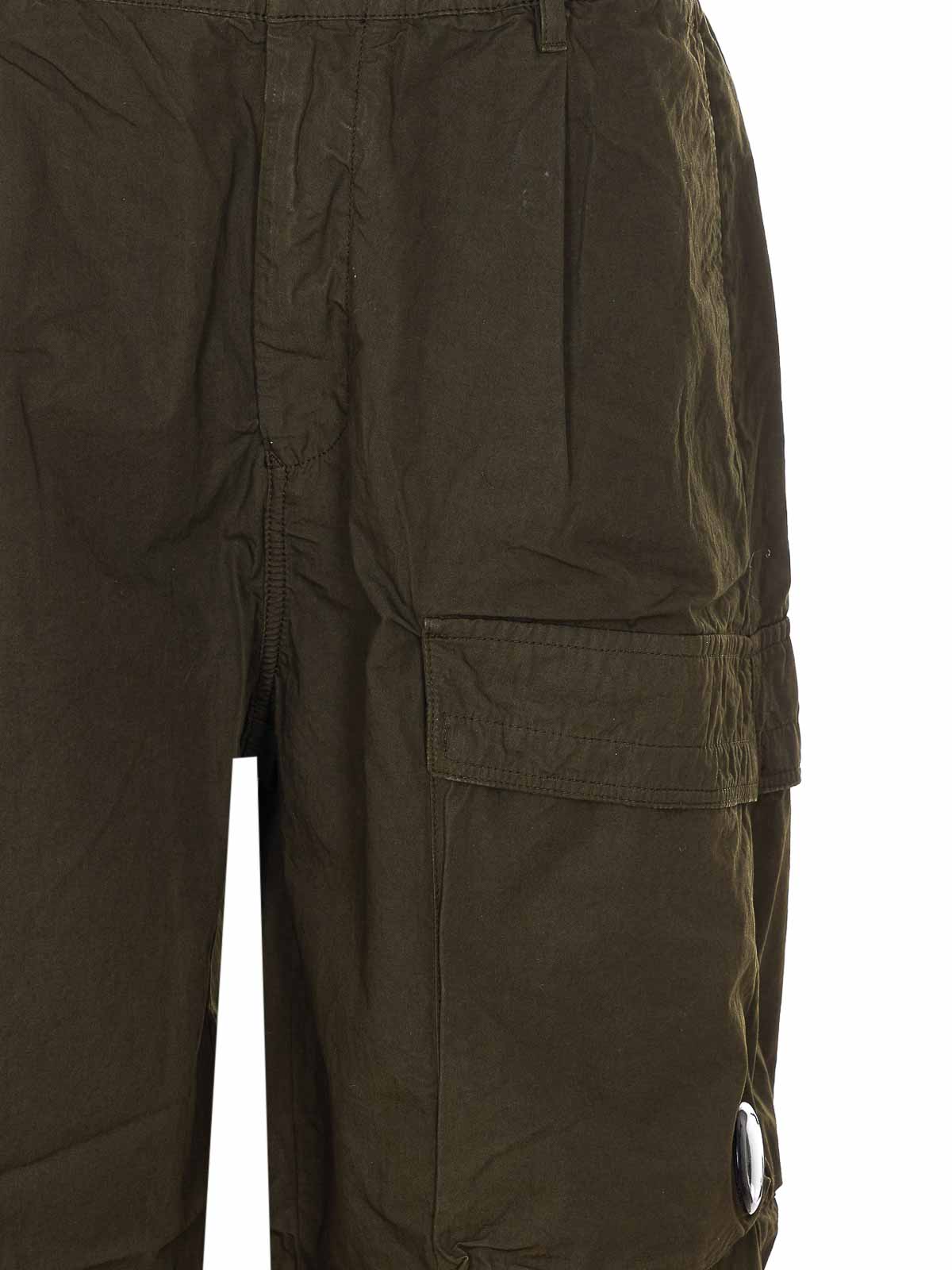 C.p. pantaloni company in micro reps verde ovy, chiusura con zip e bottoni, tasche laterali, patch logo sul retro, tasche, gamba ampia, logo patch maschera