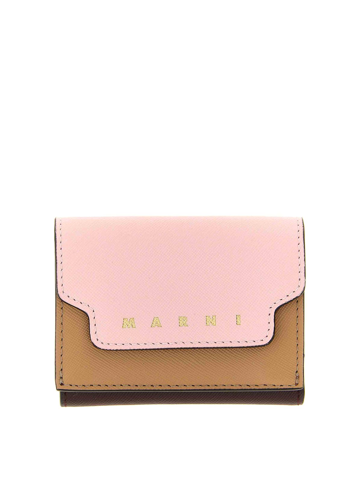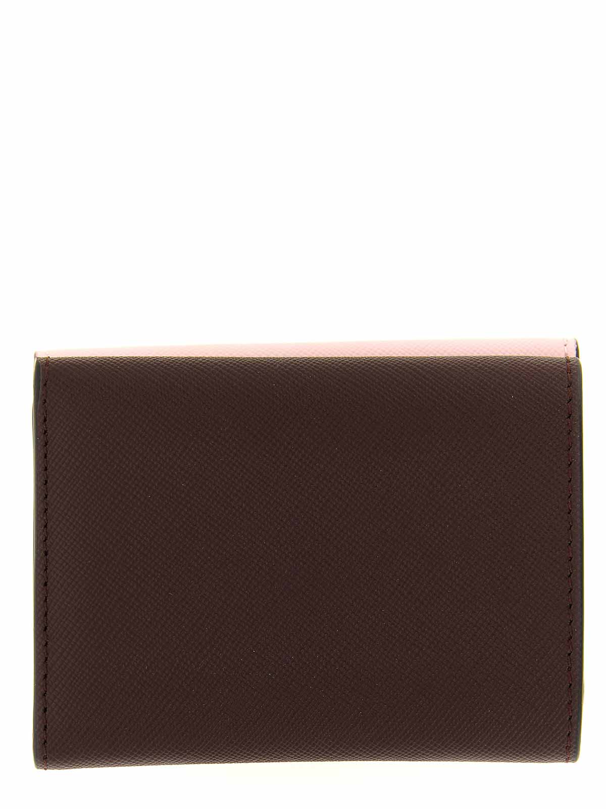 Portafoglio in pelle saffiano, modello trifold con chiusura a doppia patta con bottone a pressione e logo in rilievo frontale.