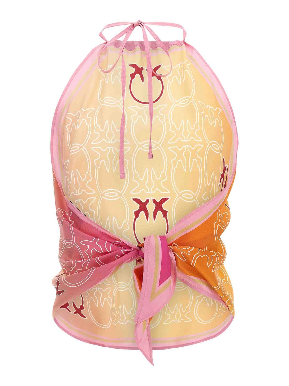 top 'synchro' in twill di viscosa e seta con stampa monogramma, allacciatura al collo, da annodare dietro, schiena nuda, fondo asimmetrico.