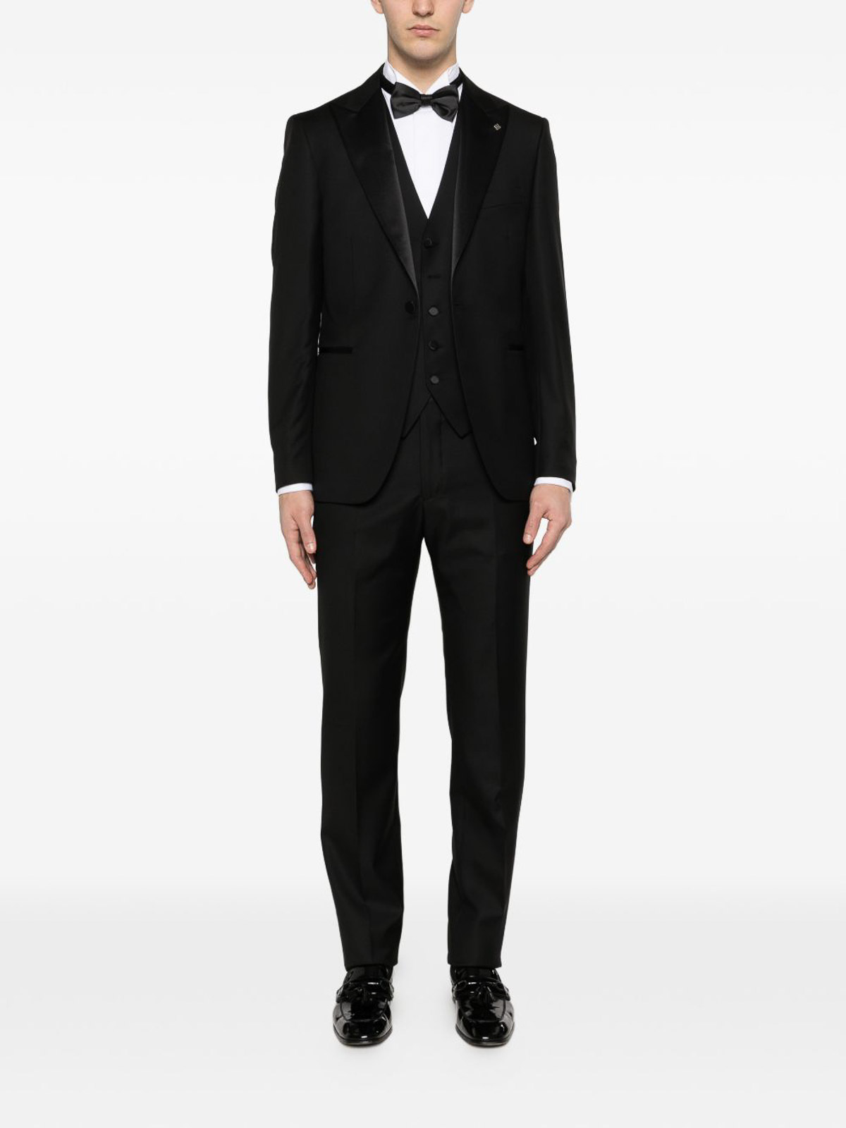 Smoking nero in lana di Lardini con revers in raso, chiusura con bottoni e tasche con patta, abbinato a pantaloni con tasche a filetto posteriori. realizzato su misura per serate formali e occasioni speciali, questo smoking unisce l'eleganza senza tempo alla raffinatezza moderna. la silhouette elegante e i dettagli lucenti creano un look raffinato e distinto adatto a un guardaroba sofisticato